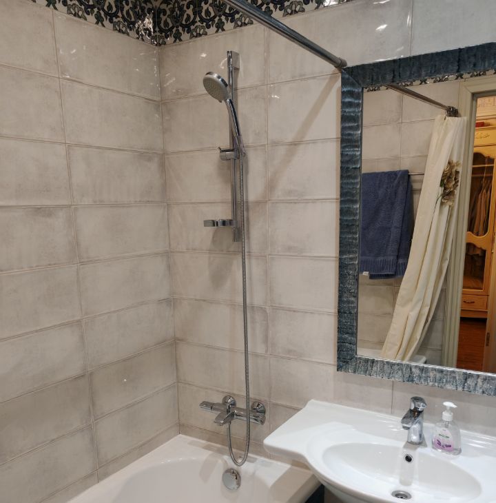 Качественный ремонт, полы паркет, вся мебель из массива, кондиционер. Встроенная кухня с посудомоечной машиной Bosch, кофемашиной, микроволновой печью, набором посуды.