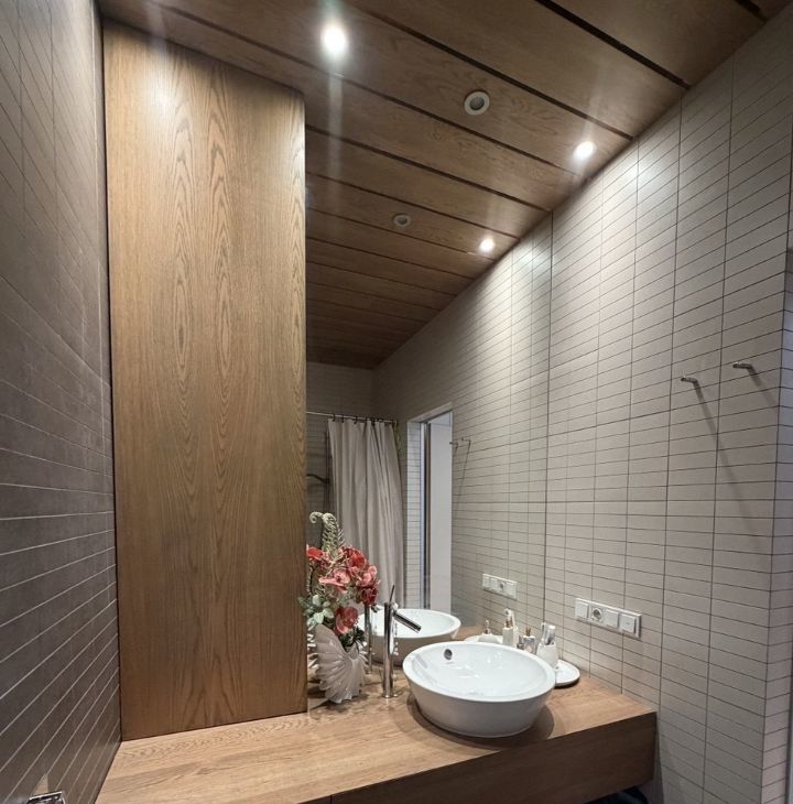 Отделка: В спальне — натуральная дубовая паркетная доска. В гостиной и ванной — стильный керамогранит с системой подогрева пола.