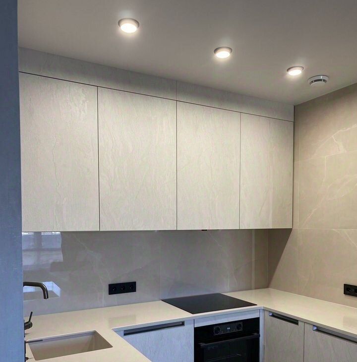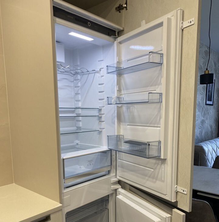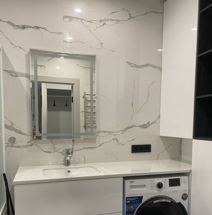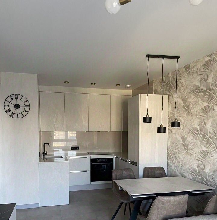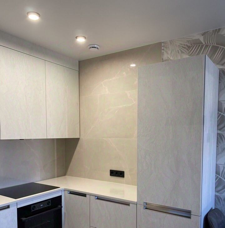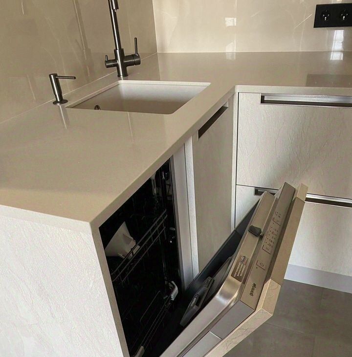 В квартире просторная кухня-гостиная с кухонным гарнитуром Мария и каменной столешницей, есть посудомоечная машина.