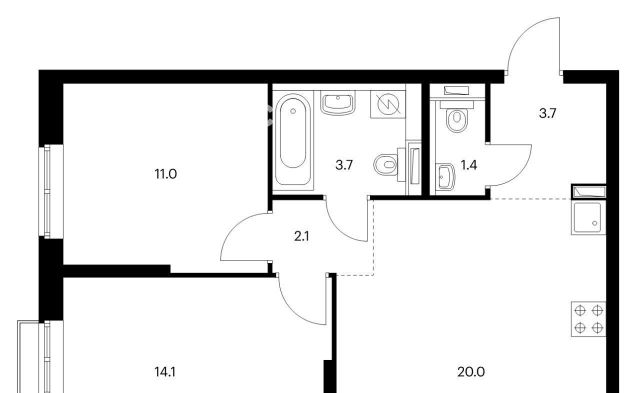 Планировка квартиры: 1) кухня-гостиная со встроенным полноразмерным