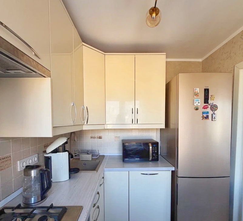 Кухня оборудована современной бытовой техникой: холодильник, посудомоечная машина, кофемашина.