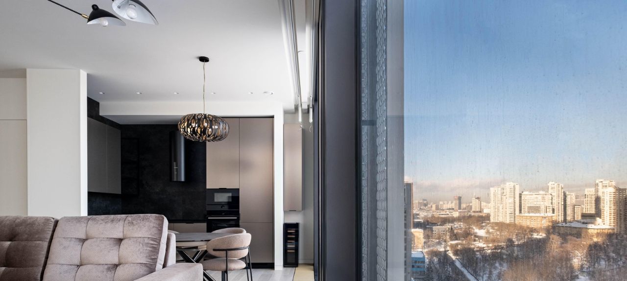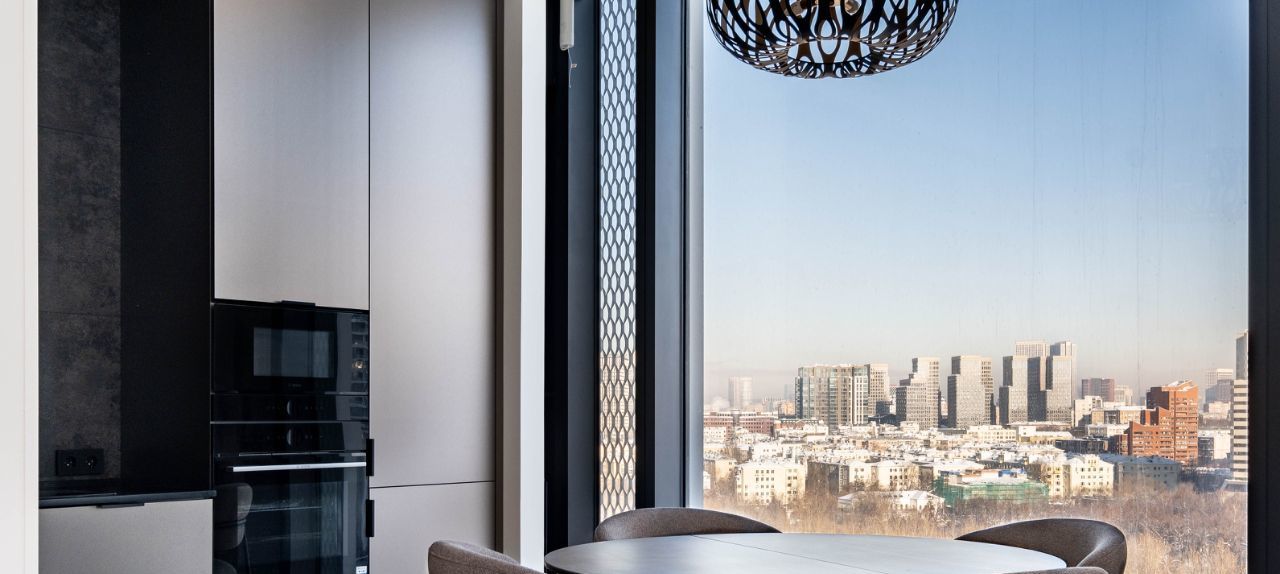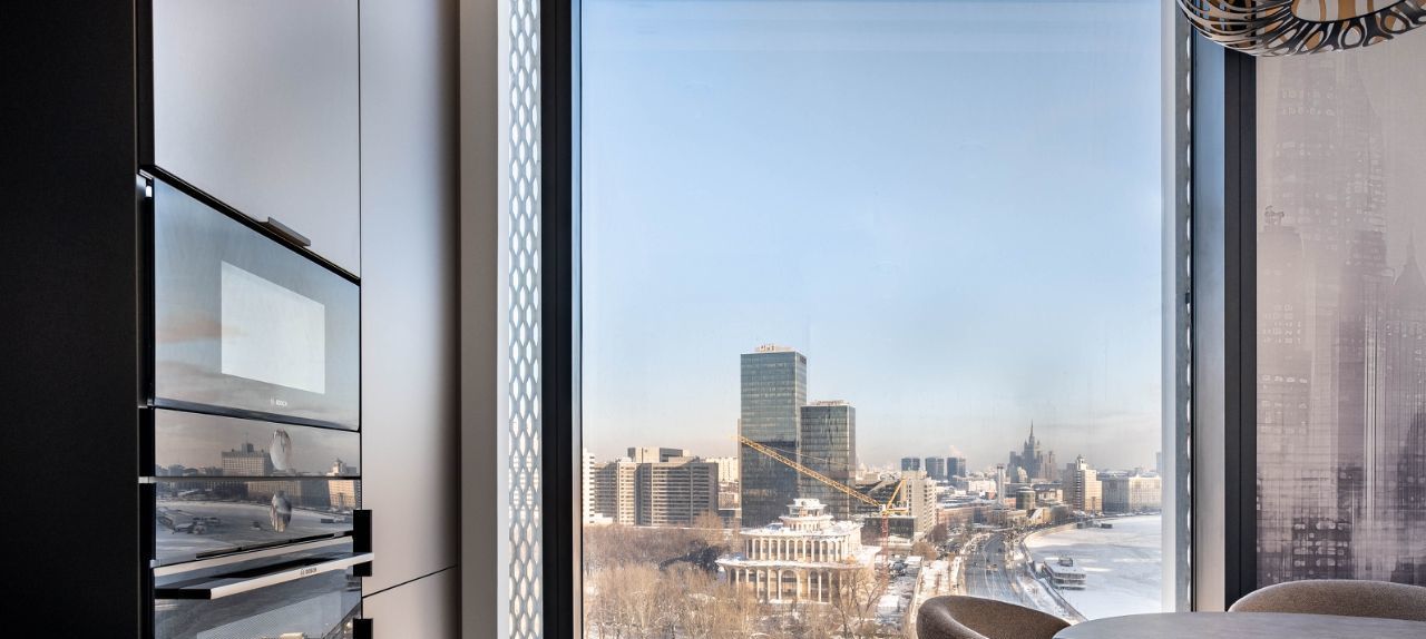 Панорамные виды из окон квартиры выходят на красивые пейзажи парка и реки и лишены каких-либо препятствий.