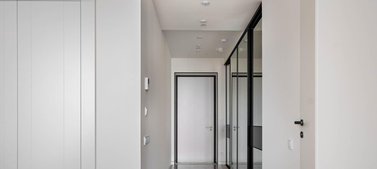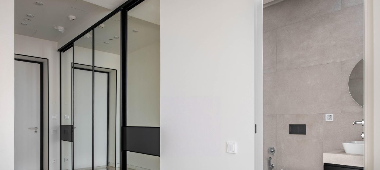 В холле предусмотрен четырехметровый встроенный зеркальный шкаф с кастомным наполнением, спроектированным профессиональным дизайнером интерьера мебели.