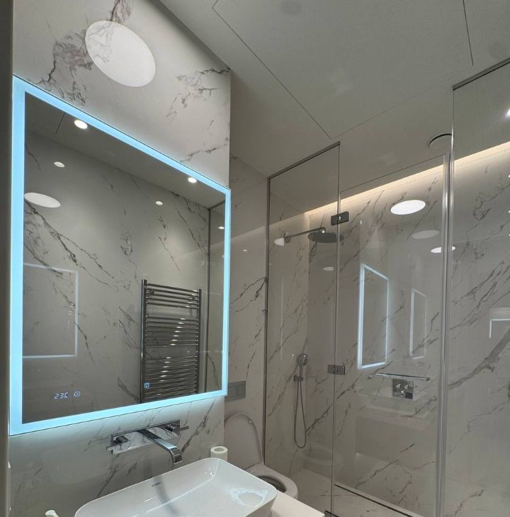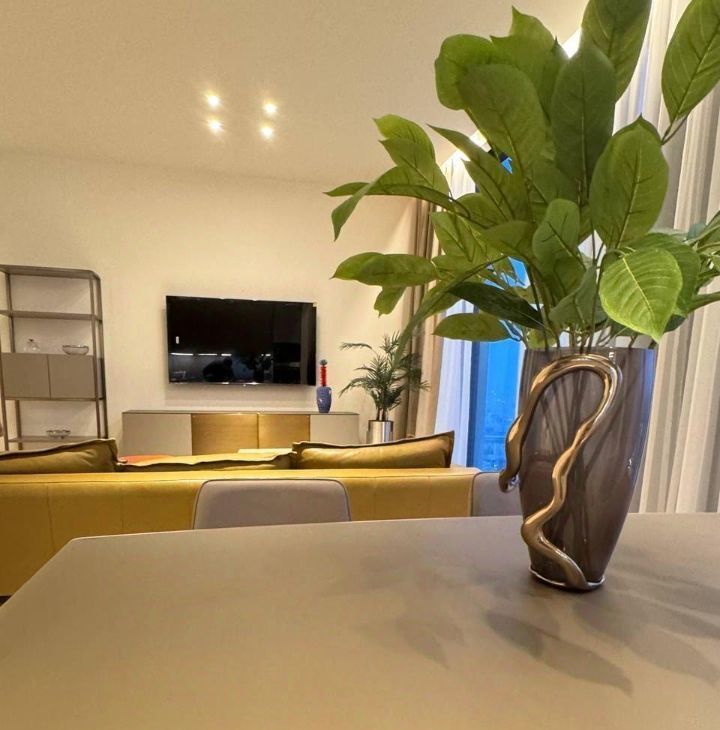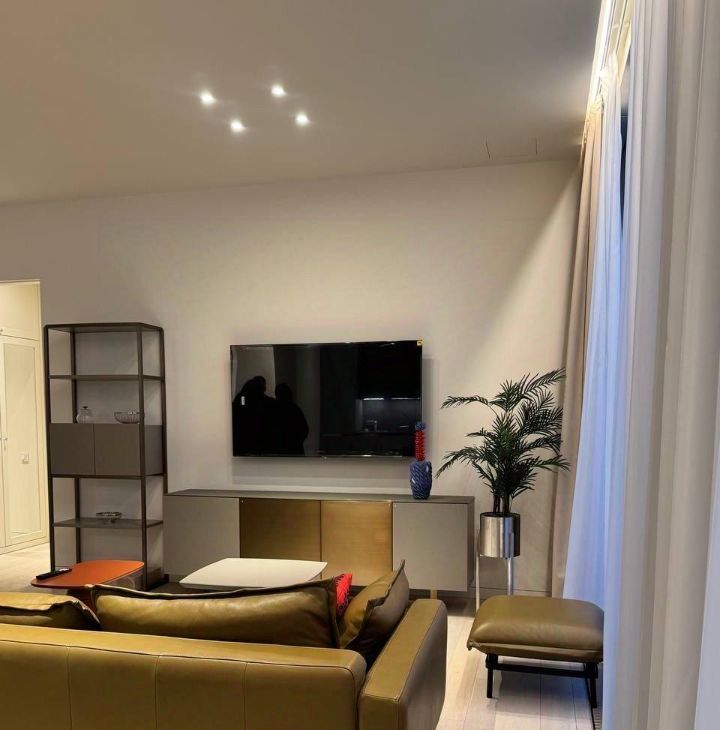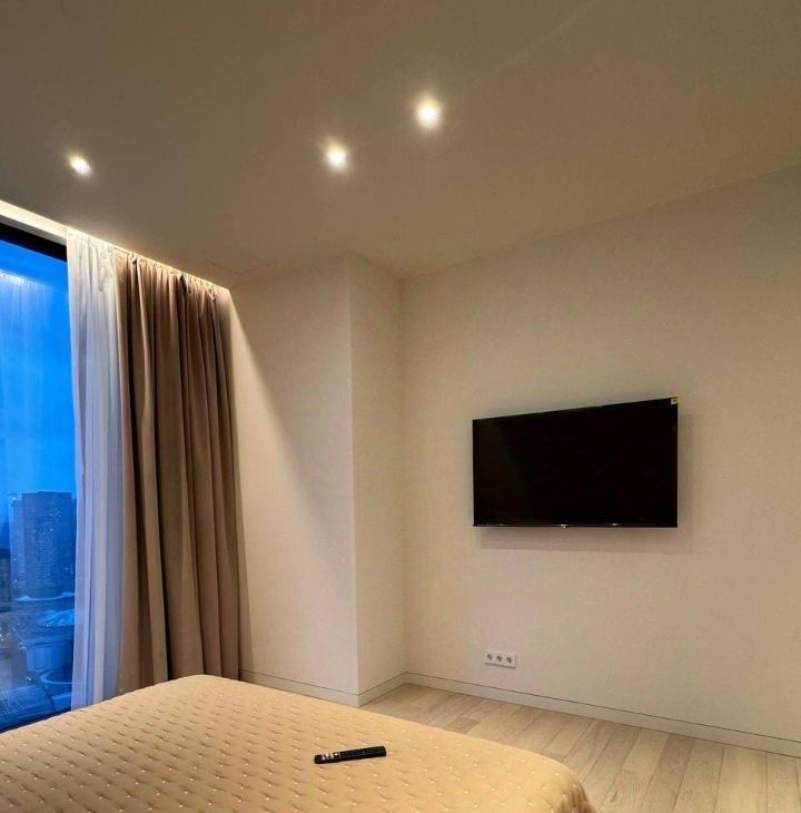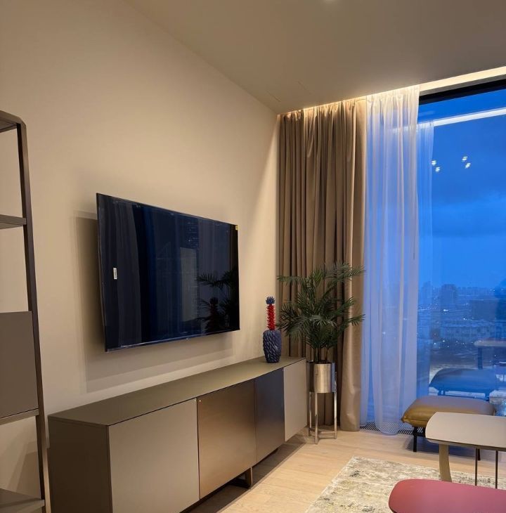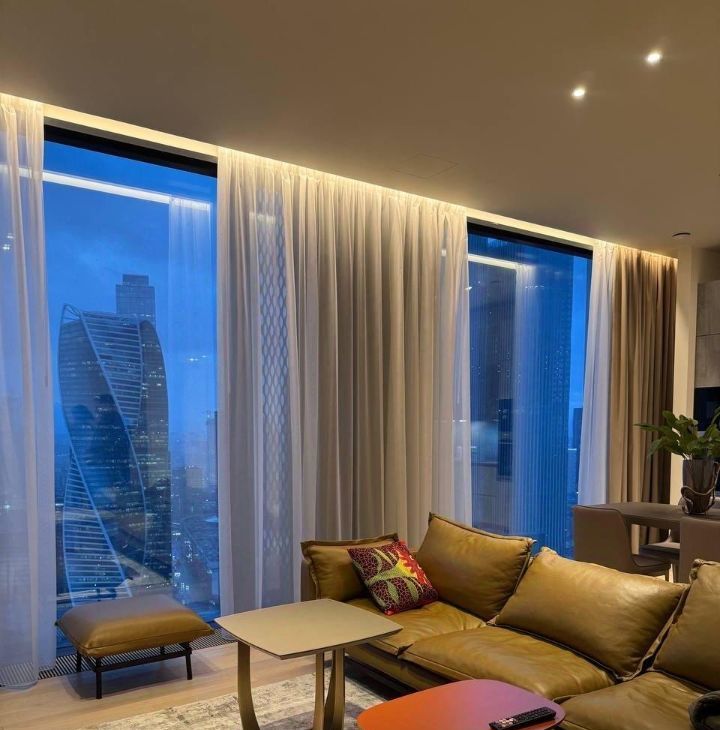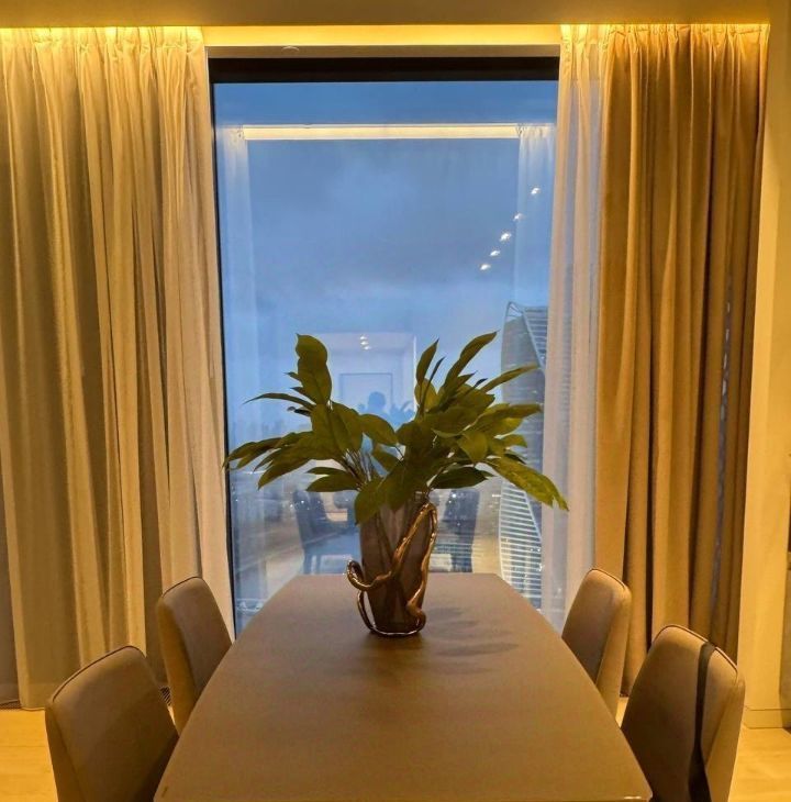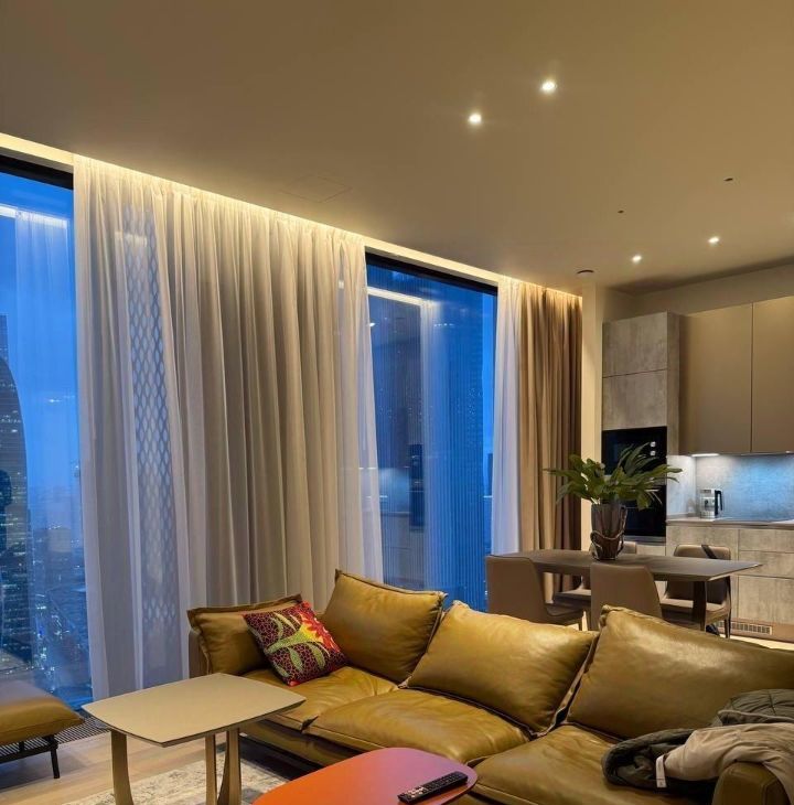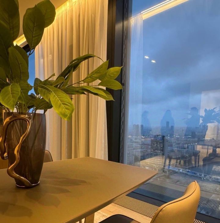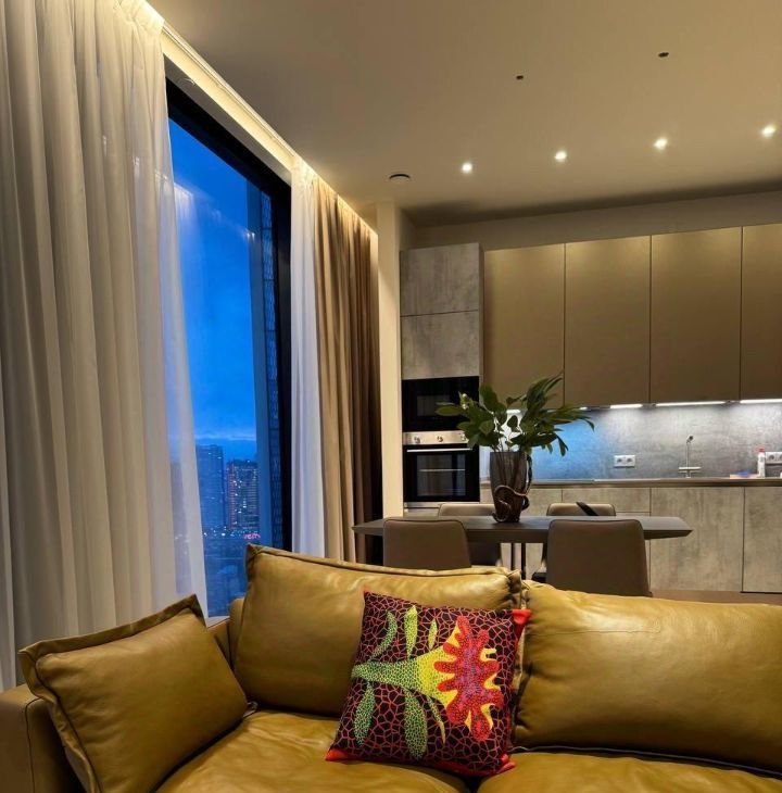 Сдается в аренду стильная двухкомнатная квартира с дизайнерским ремонтом в престижном районе Москва-Сити. Общая площадь — 80 кв. м, жилая площадь — 55 кв. м, кухня — 15 кв. м. Квартира расположена на 36-м этаже современного 69-этажного панельного дома, построенного в 2023 году. Из окон открывается вид на улицу.