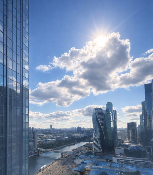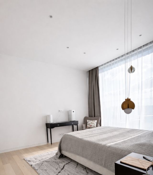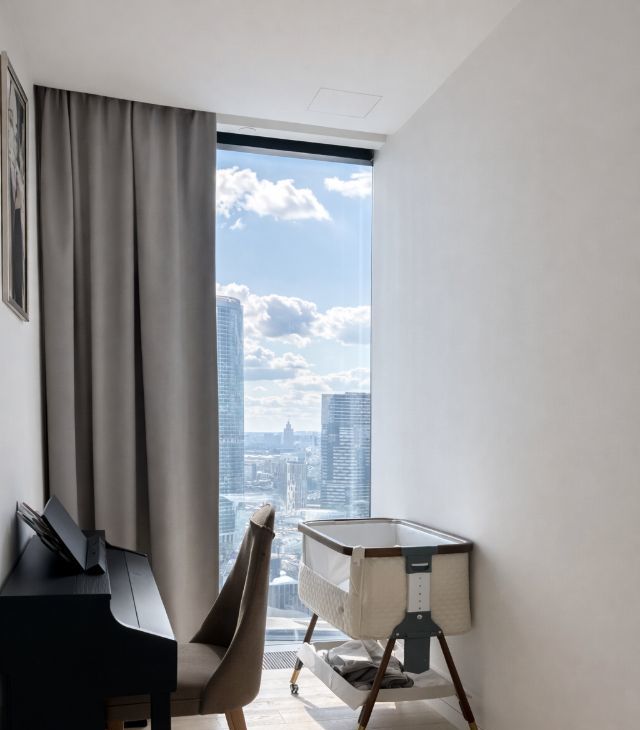 - Панорамный вид: Окна от пола до потолка открывают захватывающий вид на город, наполненный светом и пространством.