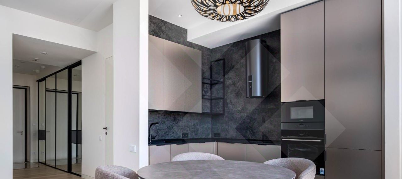 Продуманная планировка включает в себя просторную кухню-гостиную с новым итальянским кухонным гарнитуром, оснащенный премиум бытовой техникой с сенсорным управлением и ЖК-экранами, электрическим винным шкафом.
