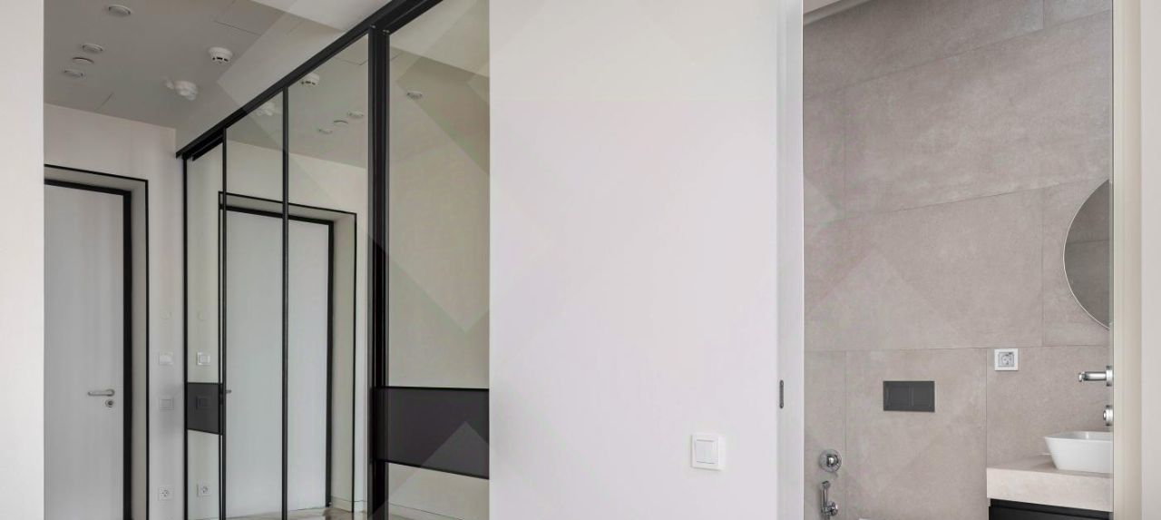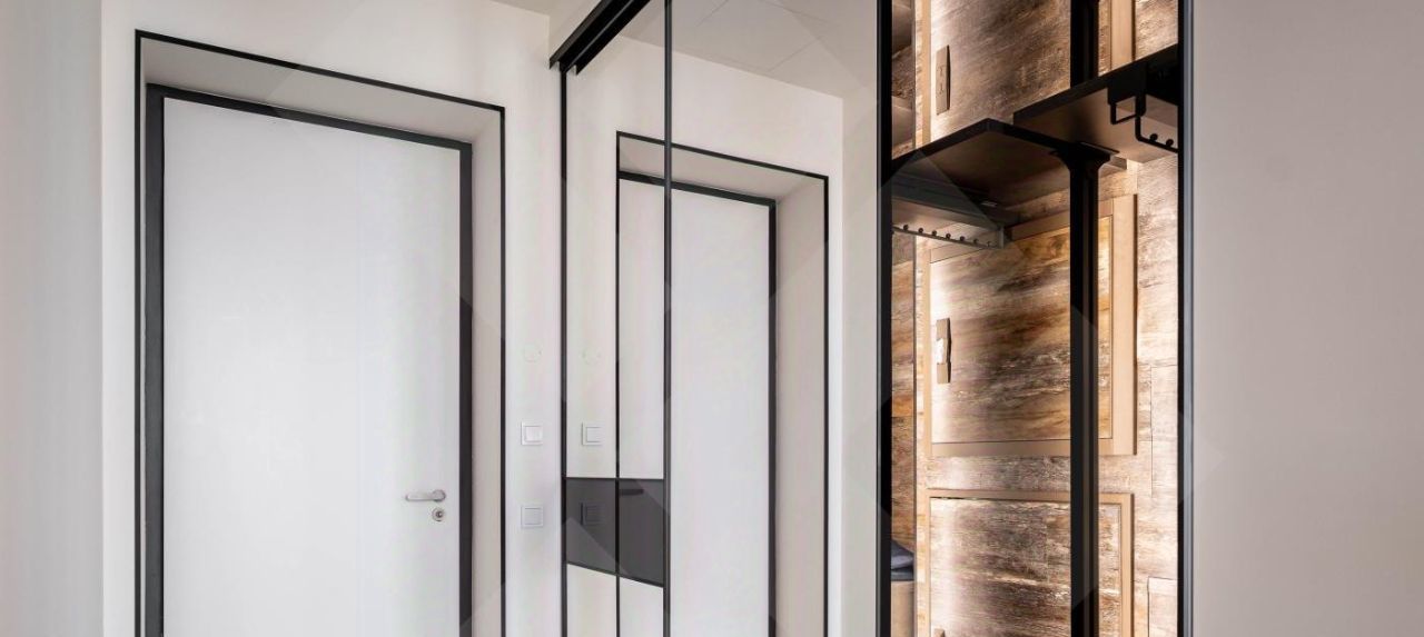 В холле предусмотрен четырехметровый встроенный зеркальный шкаф с кастомным наполнением, спроектированным профессиональным дизайнером интерьера мебели.