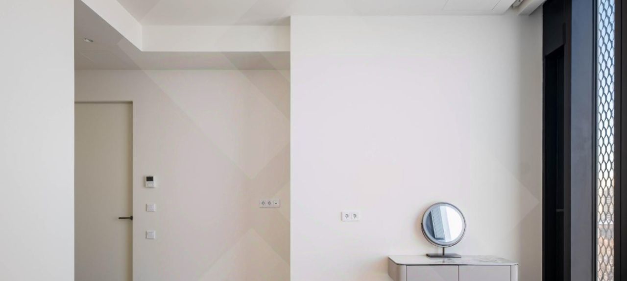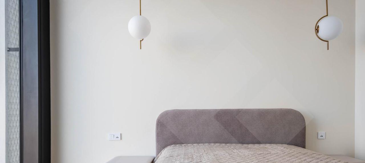 Спальня оснащена двумя полноразмерными шкафами, кроватью с премиальным ортопедическим матрасом, прикроватными тумбами из натурального дерева и бьюти-пространством с специализированным косметическим столиком.
