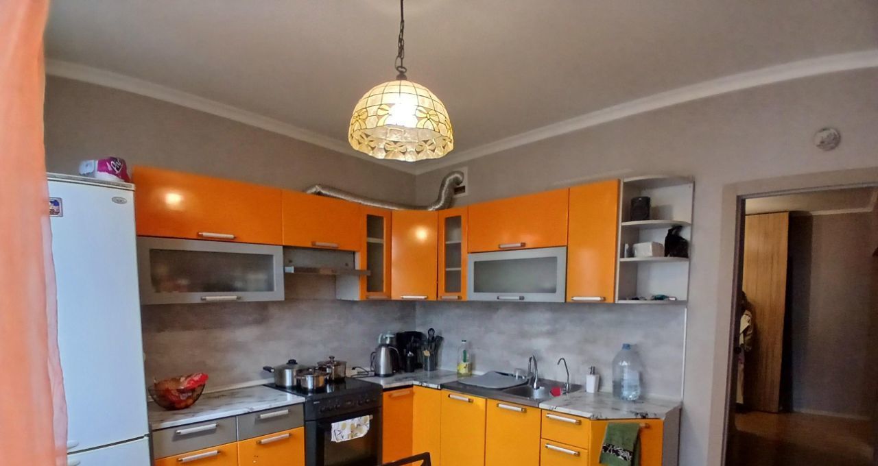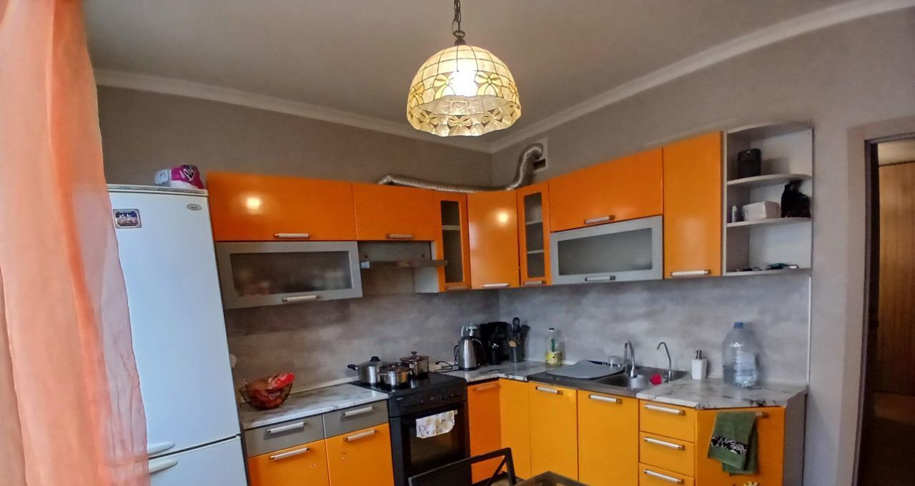 Кухня: установлена современная мебель теплого жизнерадостного оранжевого цвета, имеется вся необходимая бытовая техника, включая плиту, духовку.