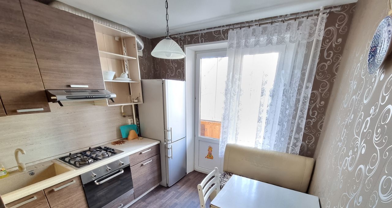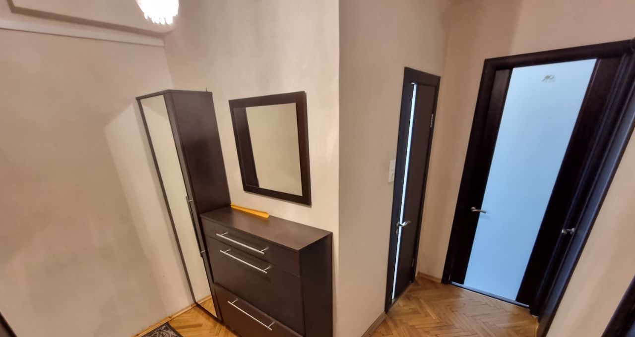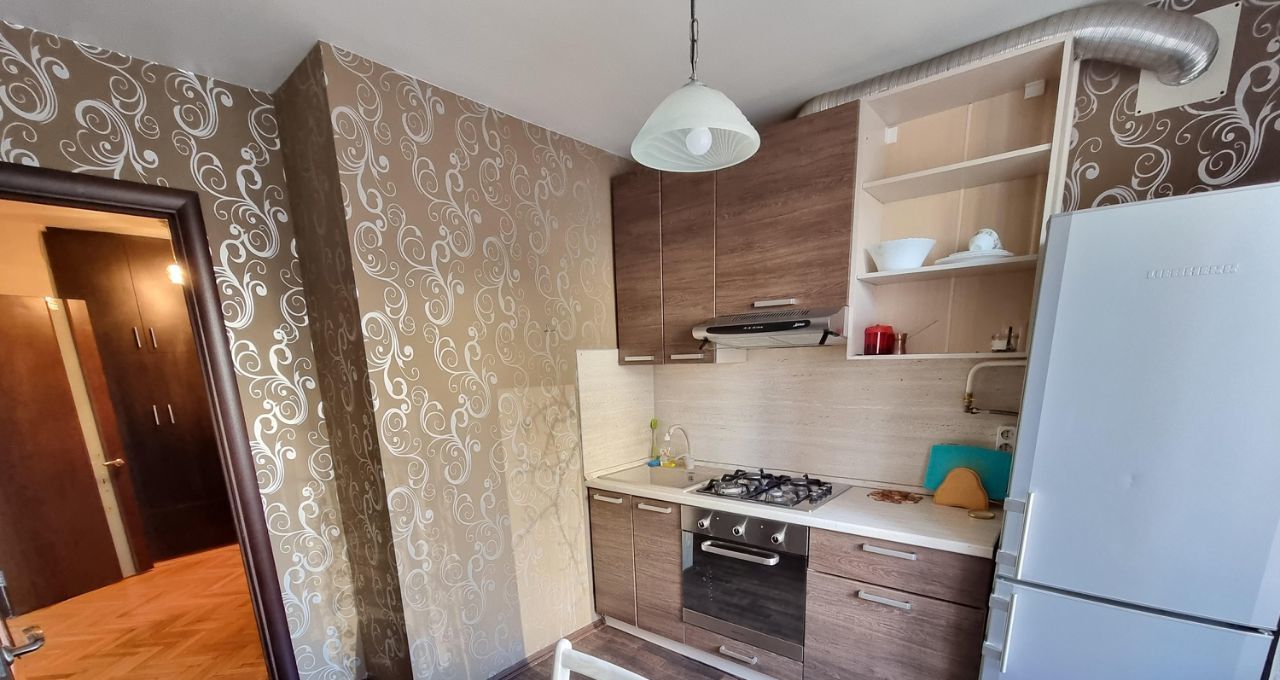 Кухня 8 м. кв. оборудована кухонным гарнитуром, холодильником, газовой плитой, электродуховкой, принудительной вытяжкой. Выход на балкон из кухни. Сантехника новая. Стиральная машина с вертикальной загрузкой в ванной комнате. В коридоре встроенный шкаф и прихожая мебель. В комнате 14 м. кв. - диван раскладной, стенка, комод и компьютерный стол. При необходимости телевизор привезут. В комнате 9 м. кв. - двухспальная кровать 160 x 200 с новым матрасом, комод и встроенный шкаф. Фото соответствуют.