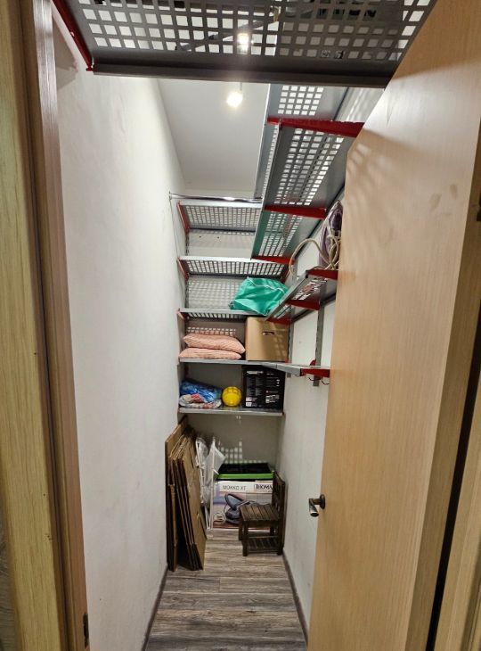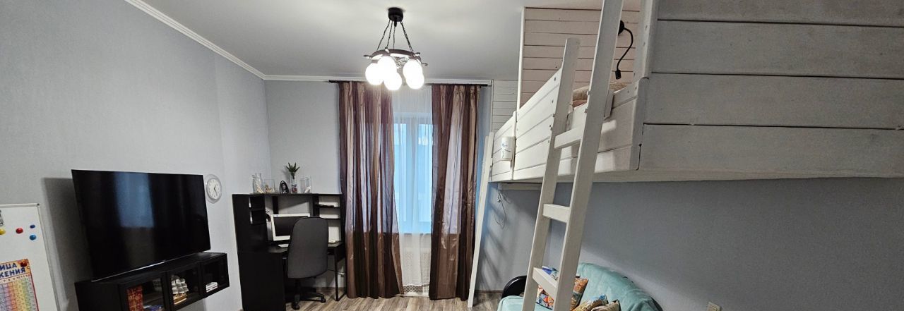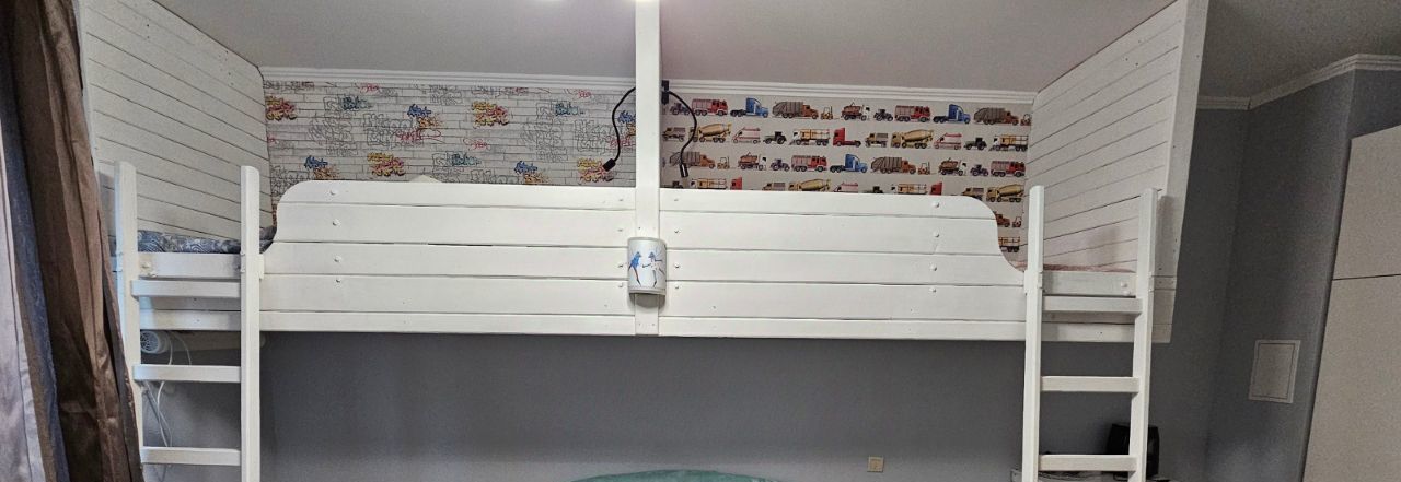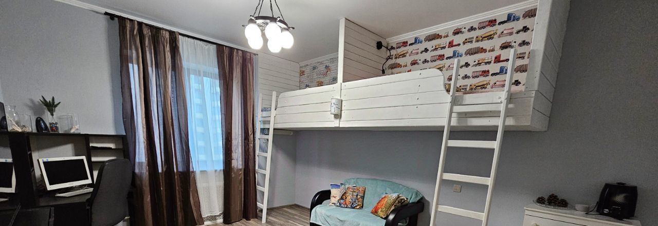 В одной из спален на заказ изготовлены две большие детские кровати, которые закреплены высоко, что позволило сохранить пространство. Также есть просторная кладовка и балкон.