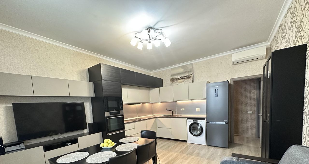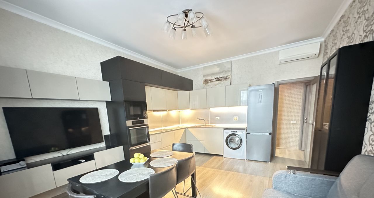Просторная кухня-гостиная площадью 20 кв.м оснащена всей необходимой техникой: кондиционер, микроволновая печь, холодильник, посудомоечная и стиральная машины, телевизор. диван раскладной.