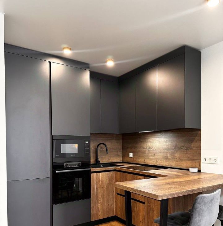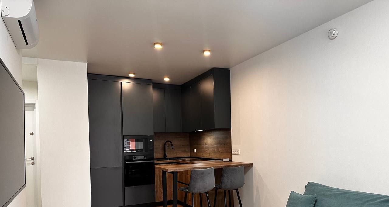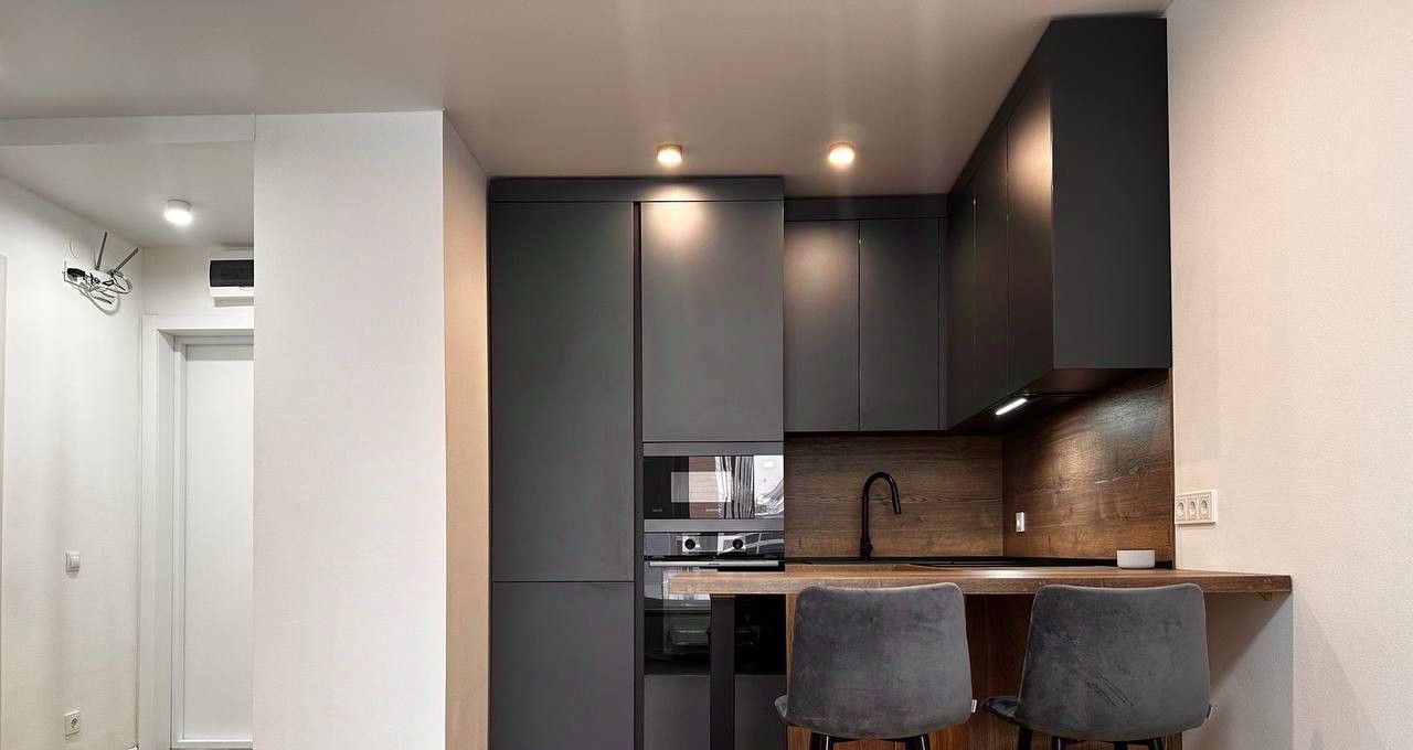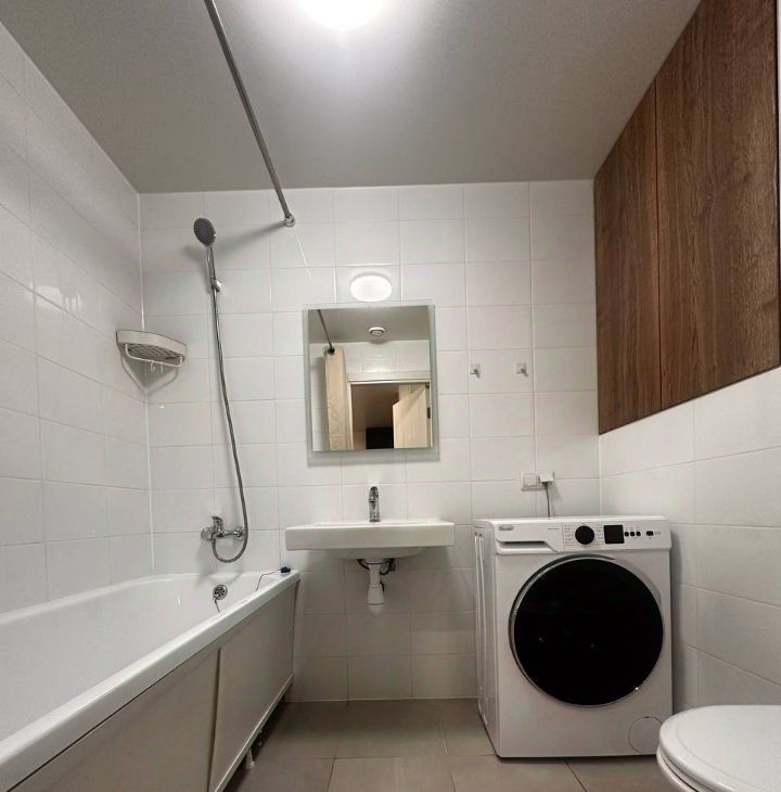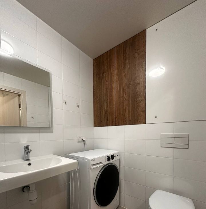 Планировка простая и удобная. Кухня с полноценной встроенной техникой и барной стойкой, рядом гостиная с большим диваном и ТВ, чтобы вечером было чем заняться кроме просмотра своих рабочих чатов. Отдельная спальня и нормальный санузел с ванной, стиральная машина стоит там же.