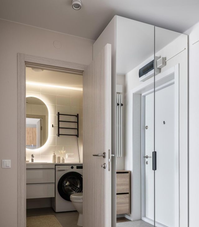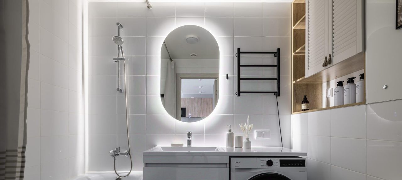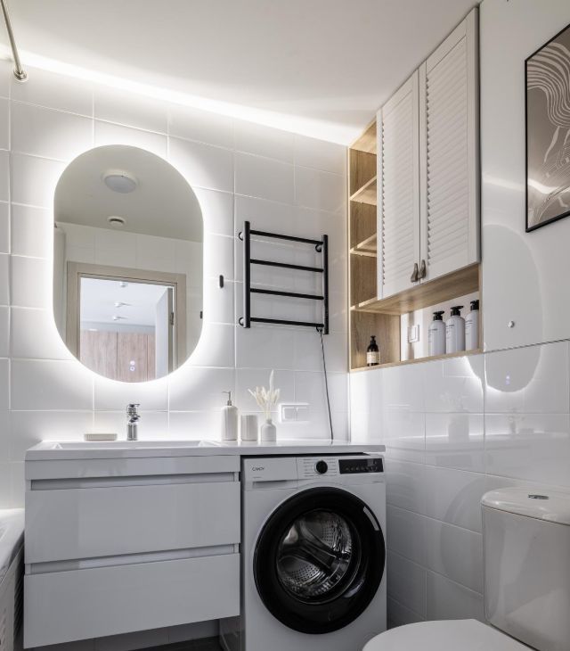 - Современная ванная с новой сантехникой, стиральной машиной и полотенцесушителем.