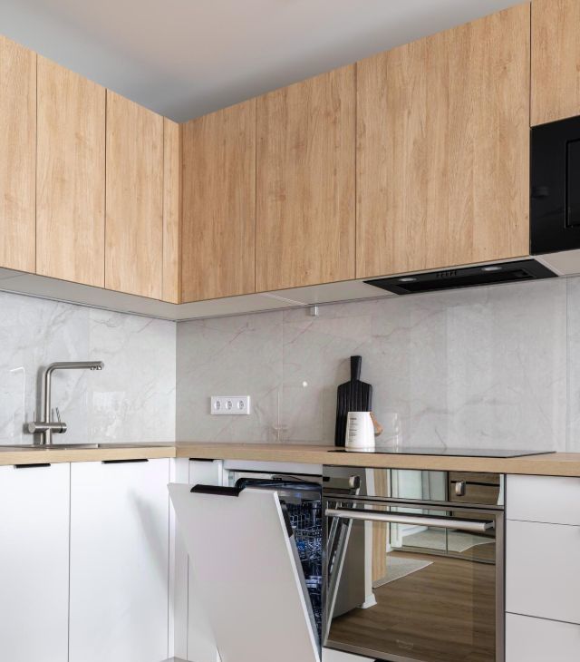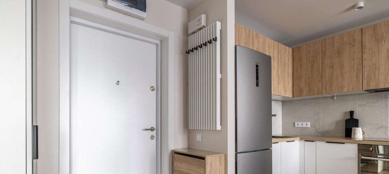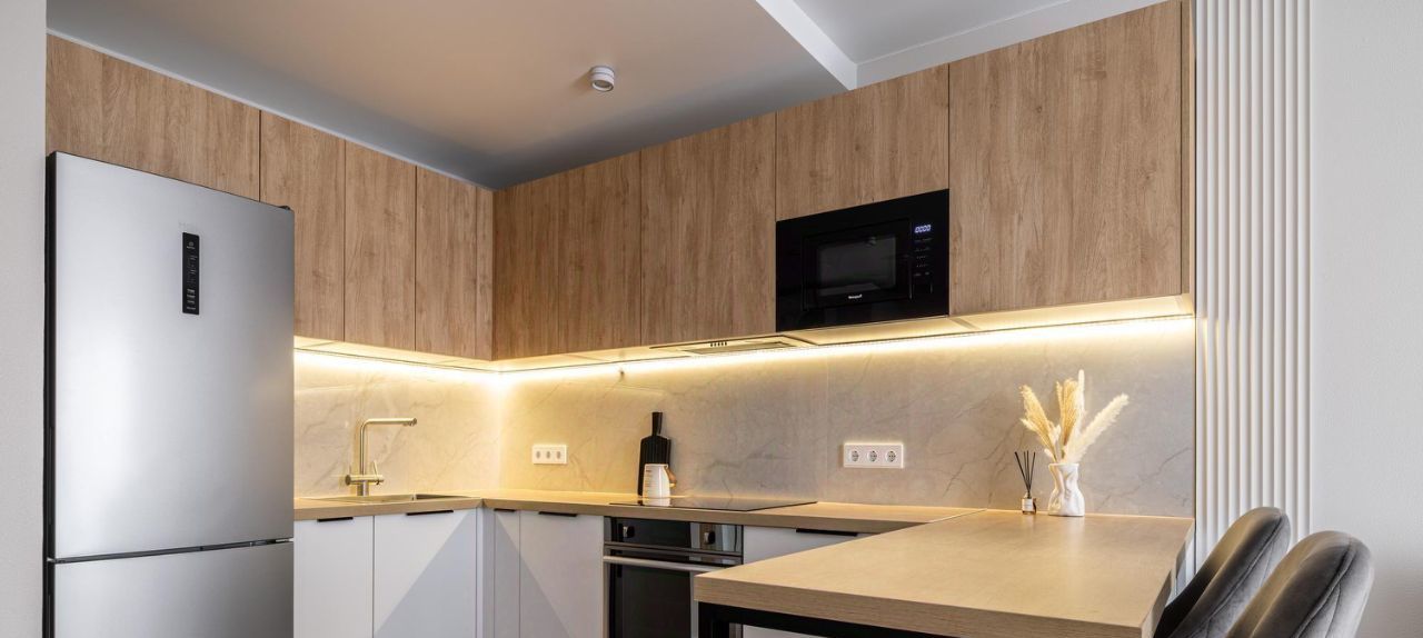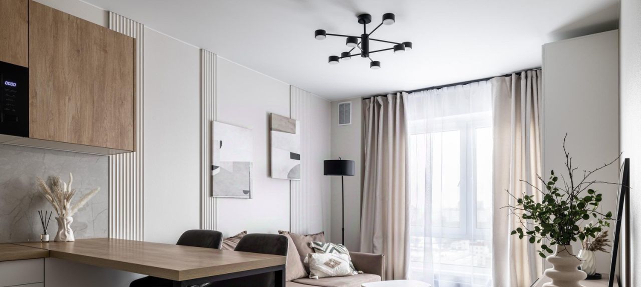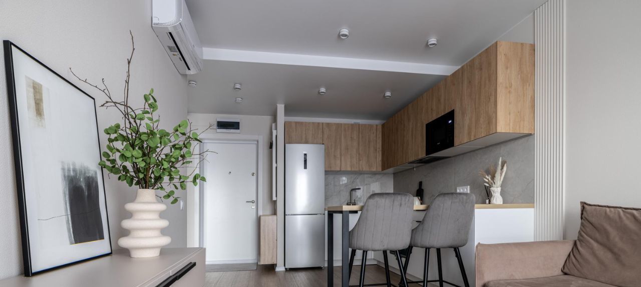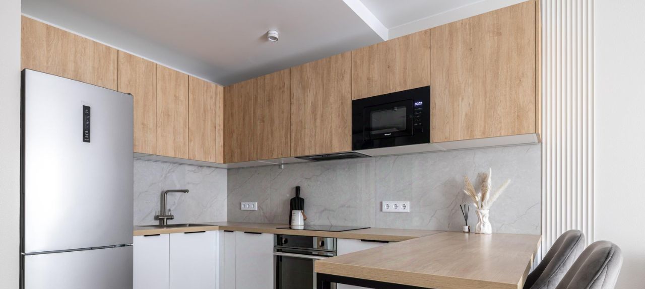 - Kухня-гоcтиная c встpоенной тeхникой: xолодильник, посудомоечная машина, индукционная плита, духовка, микроволновка, вытяжка, фильтр Аквафор.