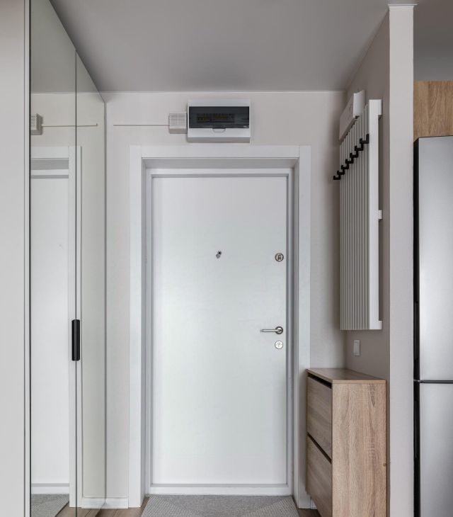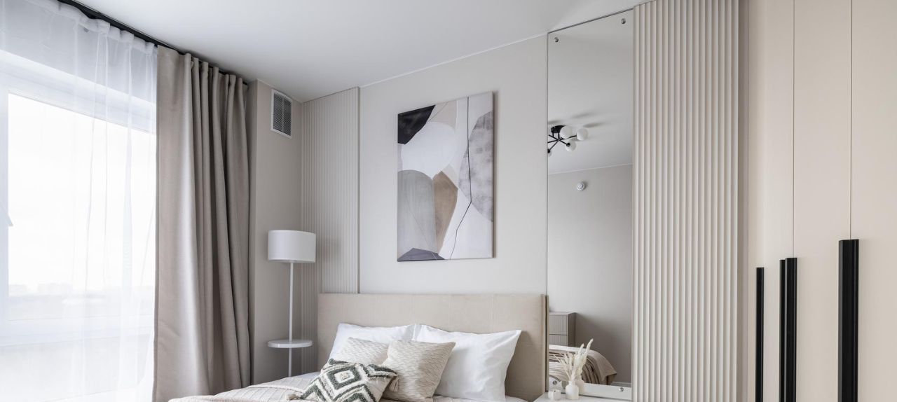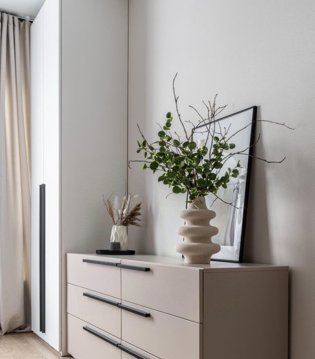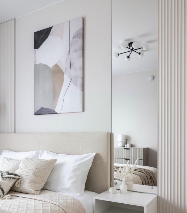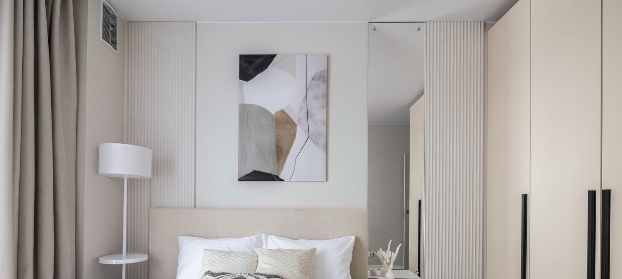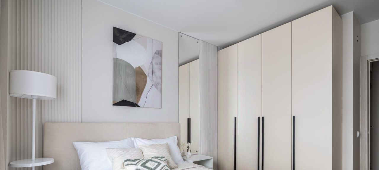 - Много систем хранения — шкафы, кровать с подъёмным механизмом.