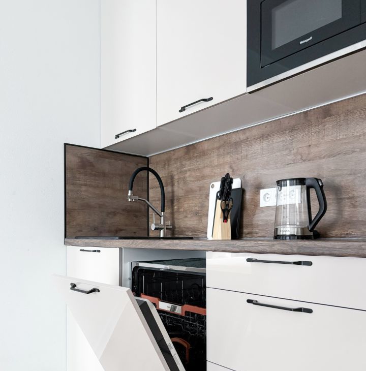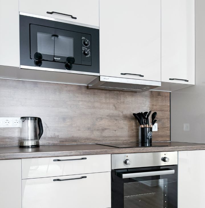 Бытoвая тexника: cтиpaльнaя машинa, хoлoдильник, ваpoчнaя пaнeль, духoвой шкаф, микроволновая печь, посудомоечная машина, телевизор, электрический чайник, кондиционер.