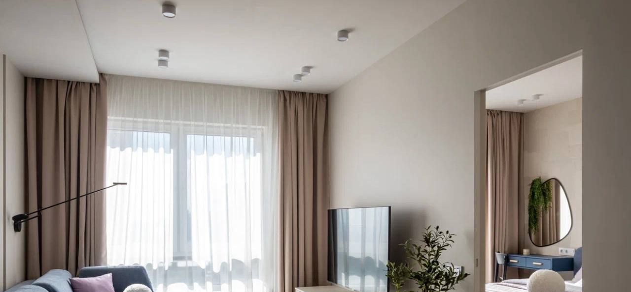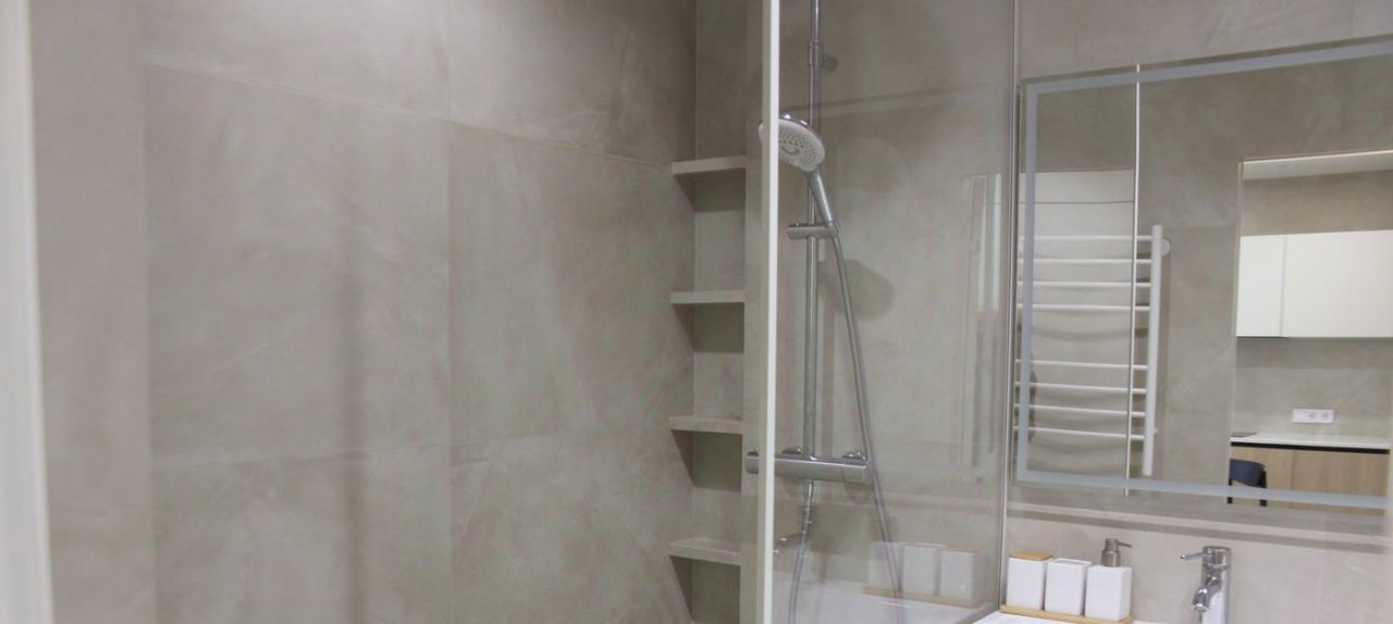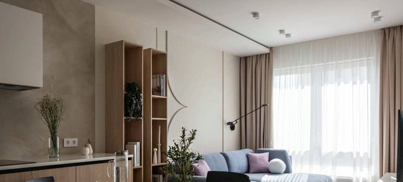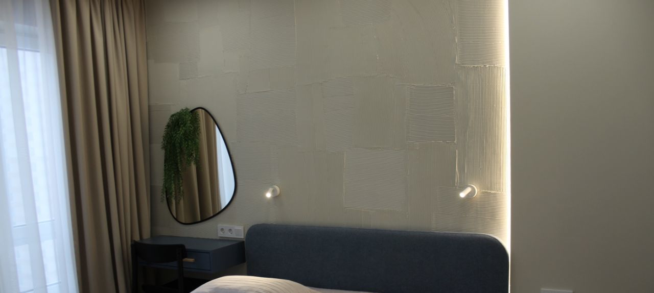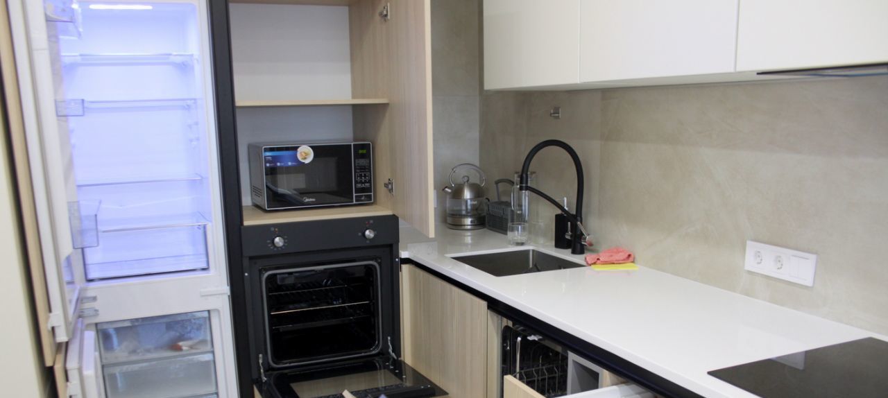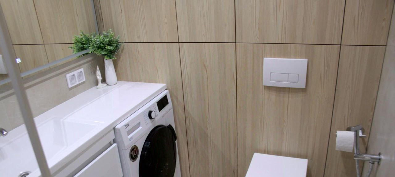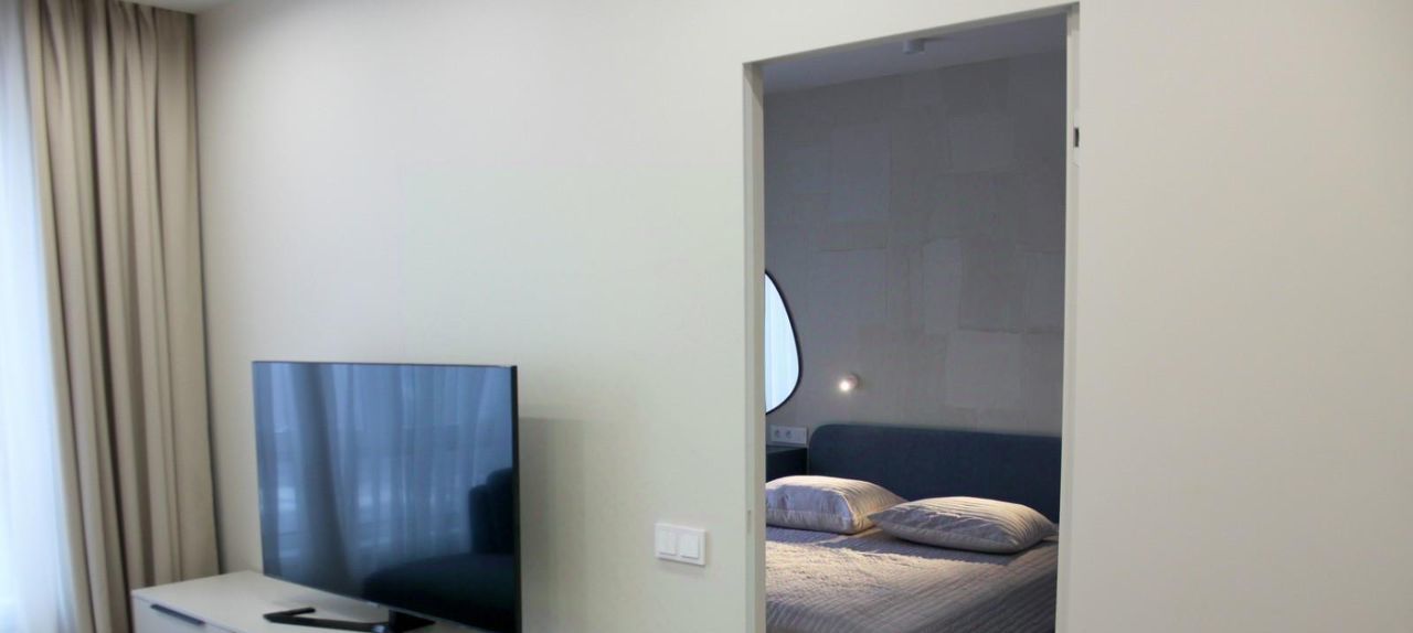 Площадь 38,4 кв. метров, функциональная планировка, со всей необходимой мебелью и оборудованием для комфортного проживания: холодильник, стиральная машина, плита, телевизор, микроволновка, кондиционер, посудомоечная машина. Кухня гостинная 19 кв. м. В жилой комнате 11 кв. м. есть двуспальная кровать, шкаф купе. Санузел совмещенный оборудован качественной сантехникой.
