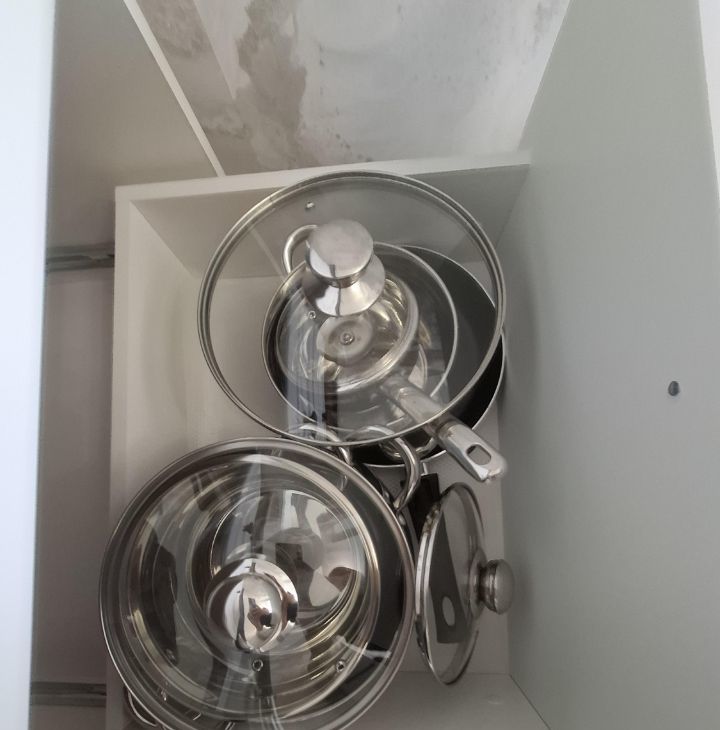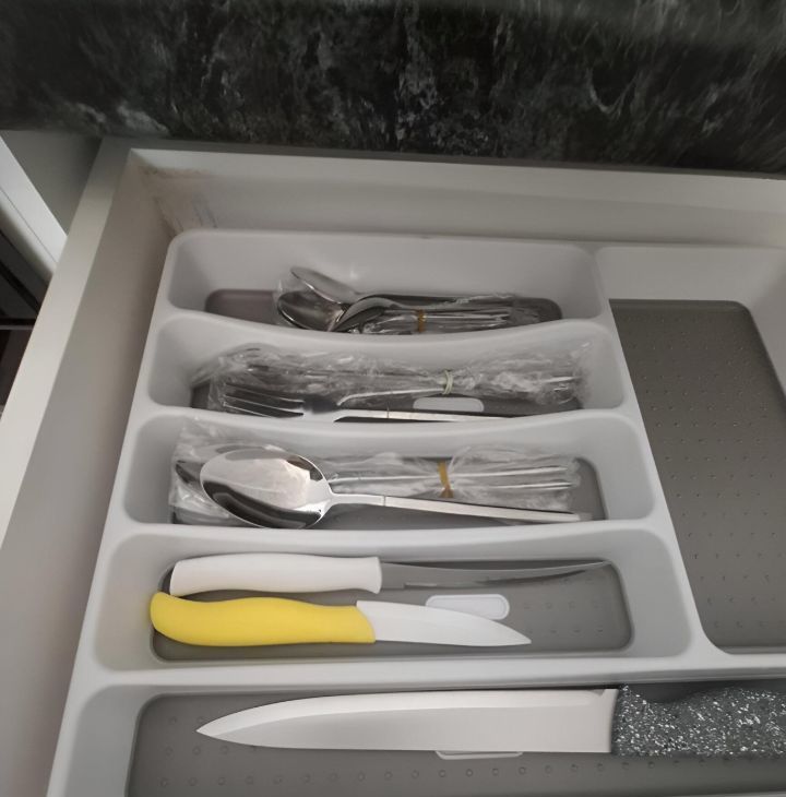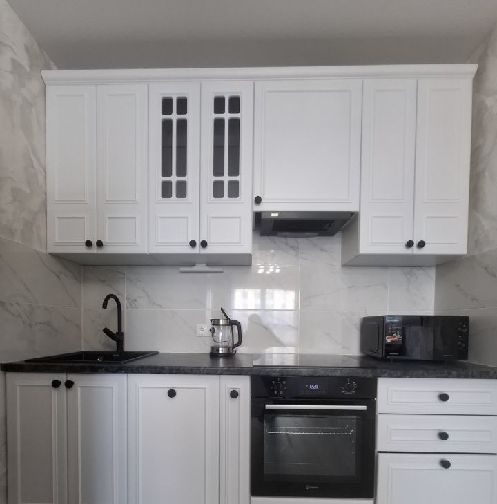 Кухонным гарнитуром+ вытяжкой, встроенной посудомоечной машиной, встроенной электрической варочной панель с духовым шкафом, двухкамерным холодильником, СВЧ- печью. Обеденным столом и стульями. Есть электрический чайник, посуда и столовые приборы - все новое.