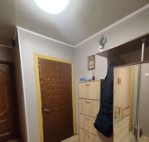 В прихожей зеркальный шкаф, обувница.