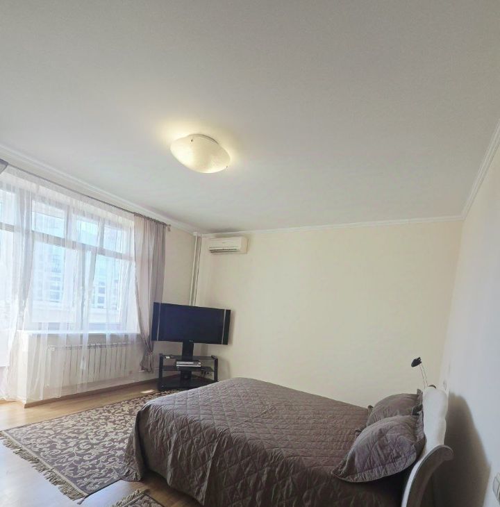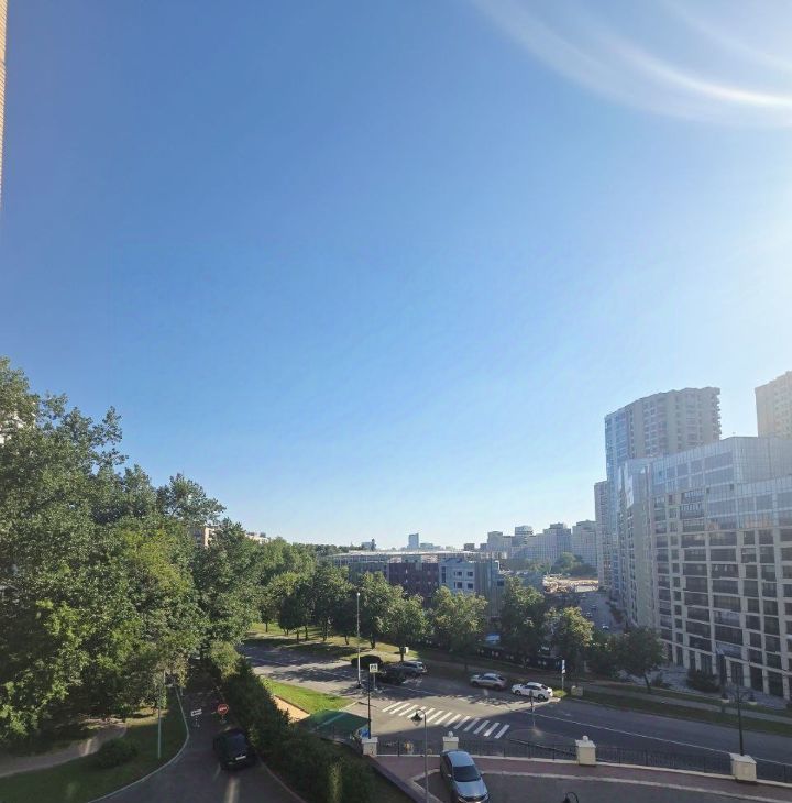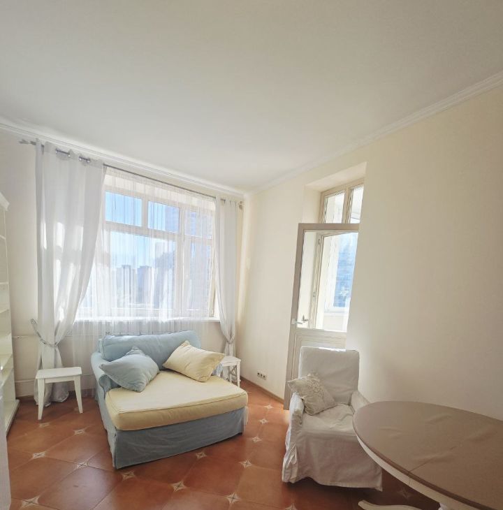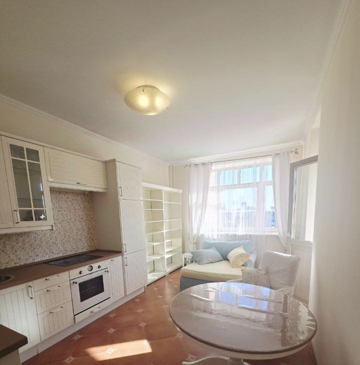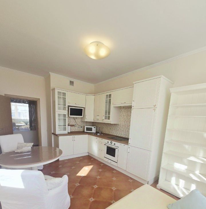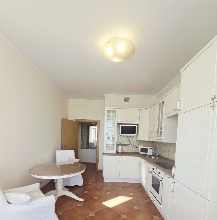 Удобная планировка с просторной кухней-гостиной и спальней, из которой открывается великолепный вид на Москва-реку.