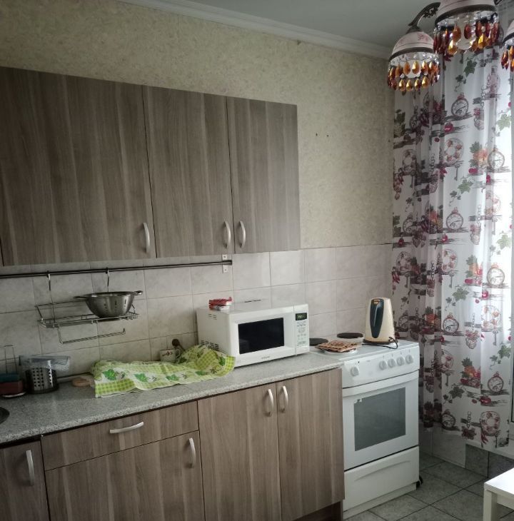 В квартире есть вся необходимая мебель: кухонный гарнитур, обеденный стол, стенка и раскладной диван в гостиной, кровать и шкаф в спальне, а также техника: холодильник, плита с духовкой, микроволновка и стиральная машина.