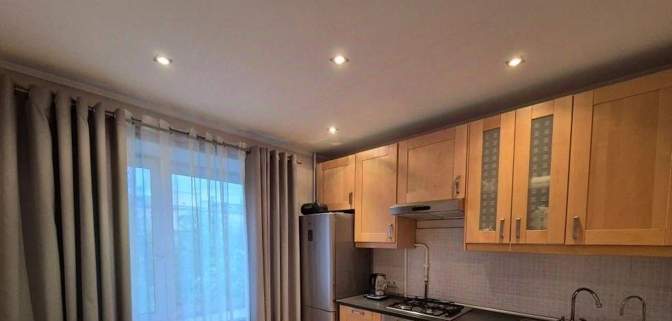 Кухня оборудована кухонным гарнитуром с деревянными фасадами и оснащена встроенной техникой: 2-камерным холодильником, 4-комфорочной плитой, духовым шкафом, посудомоечной машиной, чайником и вытяжкой.