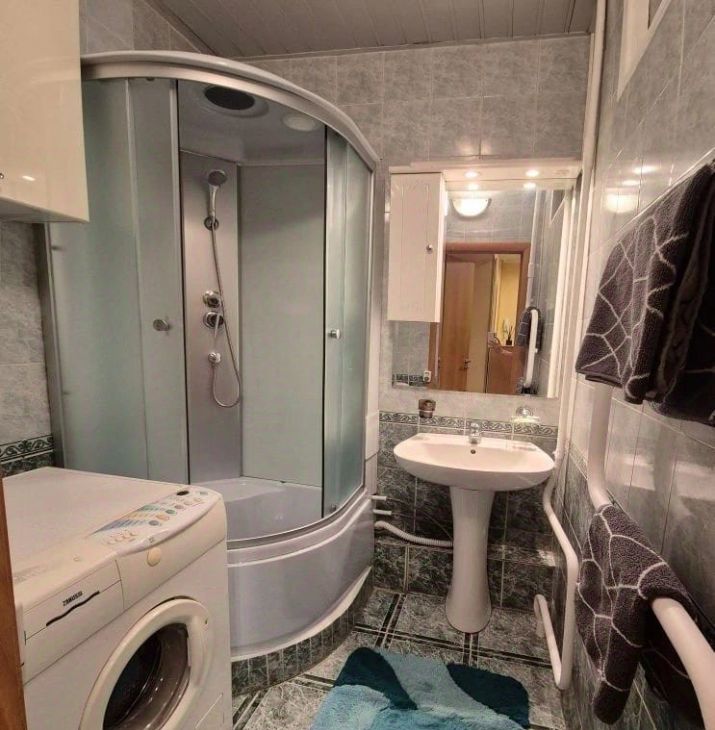 Ванная комната оборудована душевой кабиной и раковиной, вместительной стиральной машиной, большим зеркалом с подсветкой и шкафами.