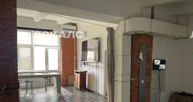 Формально в жилой зоне 2 комнаты, но фактически это большое открытое пространство, разделенное на 2 зоны. Такая компоновка традиционна для художественных студий, лофтов и творческих помещений, где выше требования к воздуху и свету.