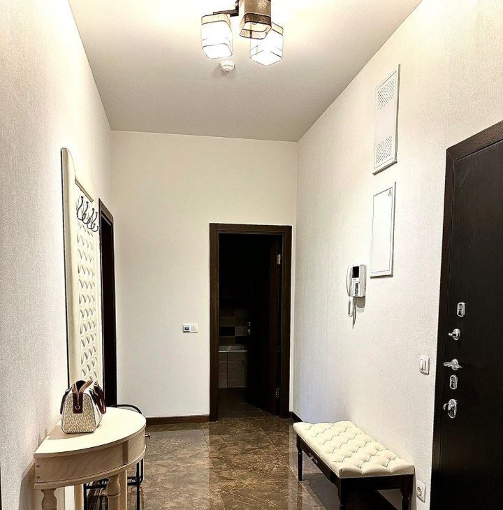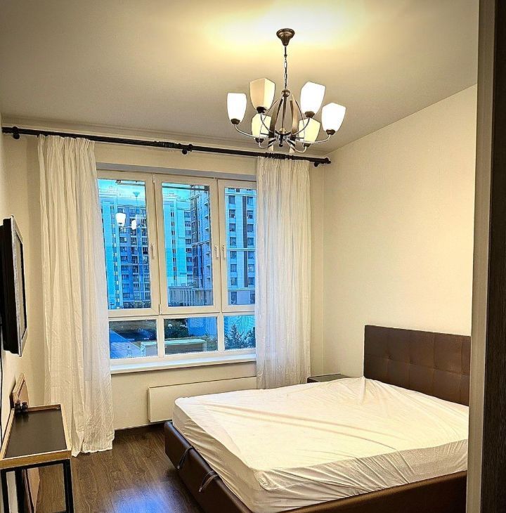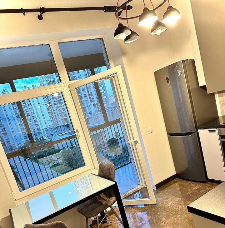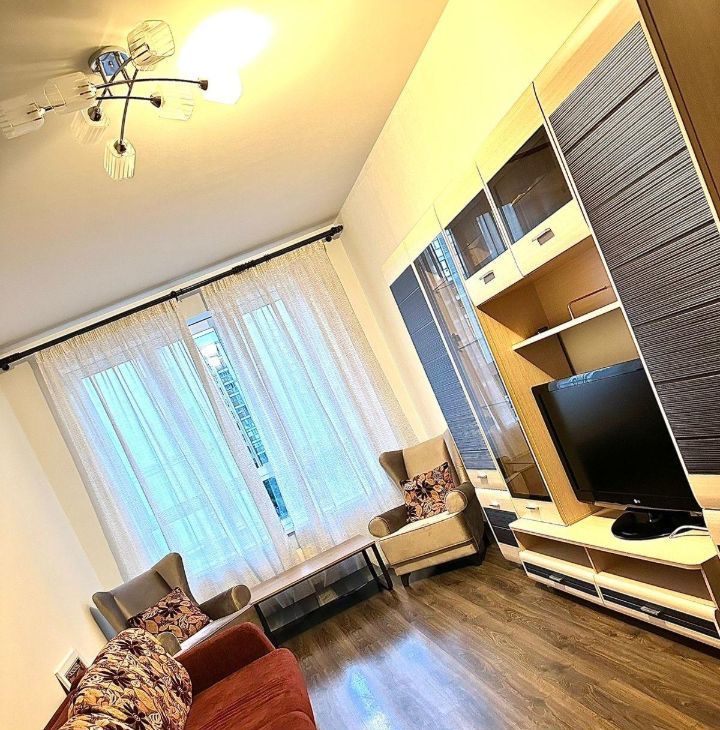 В квартире есть все необходимое для комфортного проживания: на кухне и в комнатах установлена мебель, а из техники — кондиционер, холодильник, телевизор и стиральная машина. Санузел совмещенный, есть ванна. Также имеется лоджия, где можно отдохнуть после рабочего дня.