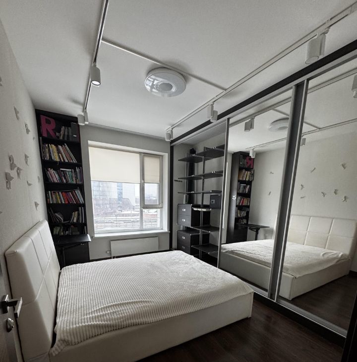 в спальне-большой встроенный шкаф-гардероб с большими зеркалами.