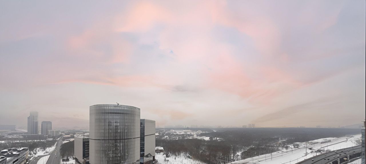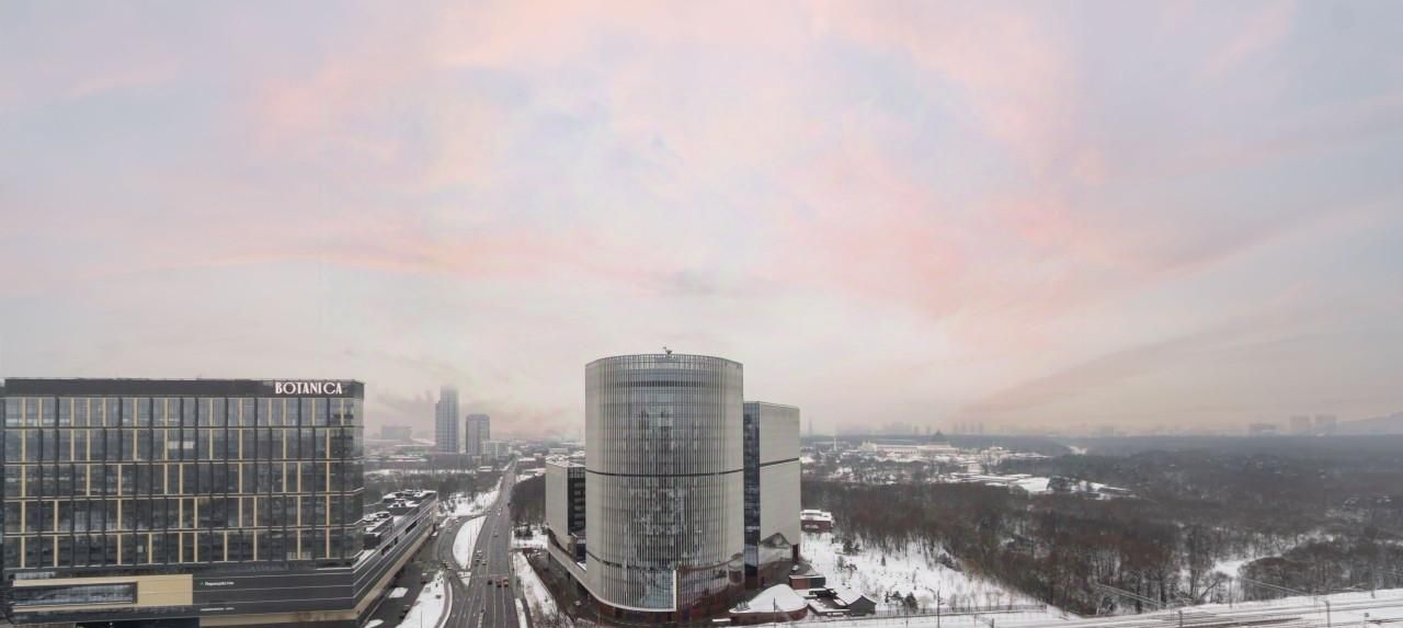 Из окон квартиры открывается прекрасный вид на стремительно развивающийся город и обширный лесной покров, меняющий свой облик в неспешном ритме.
