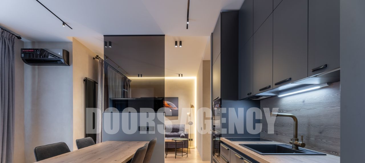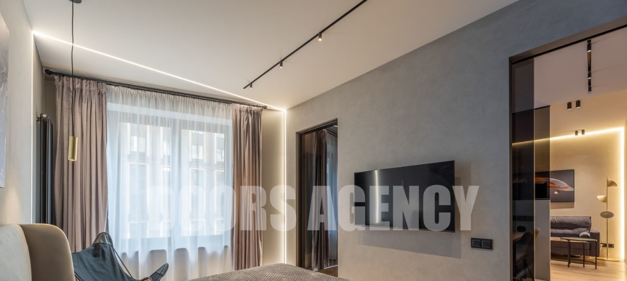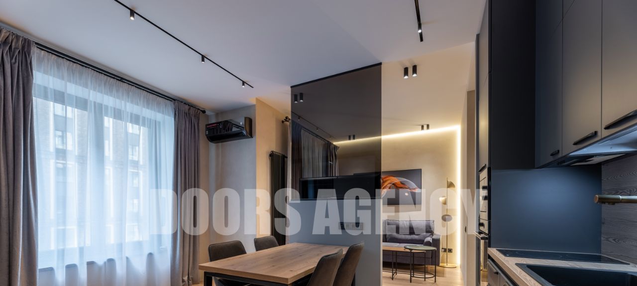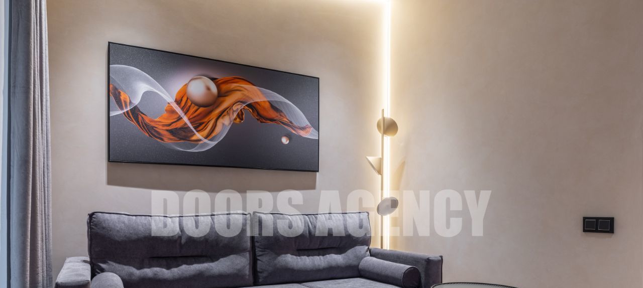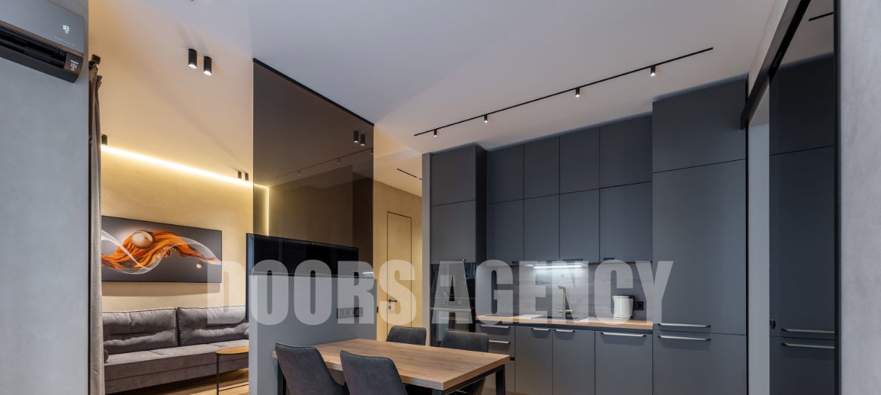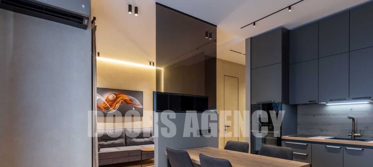 Прекрасная организация пространства: кухня-гостиная с выходом на лоджию, изолированная спальня с гардеробной, санузел совмещенный. Множество разных видов подсветки. В апартаментах имеется вся необходимая бытовая техника, в том числе: два телевизора, посудомоечная машина, кондиционер, микроволновая печь и духовой шкаф.