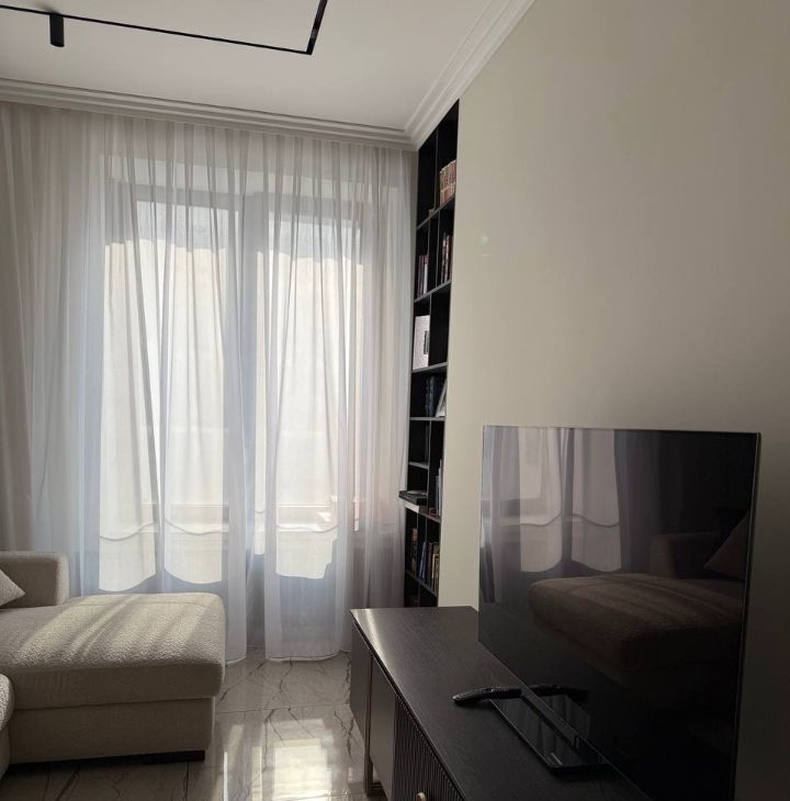 Планировка: просторный зал, совмещенный с кухней, спальня, 2 санузла, балкон.