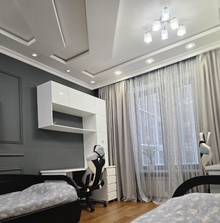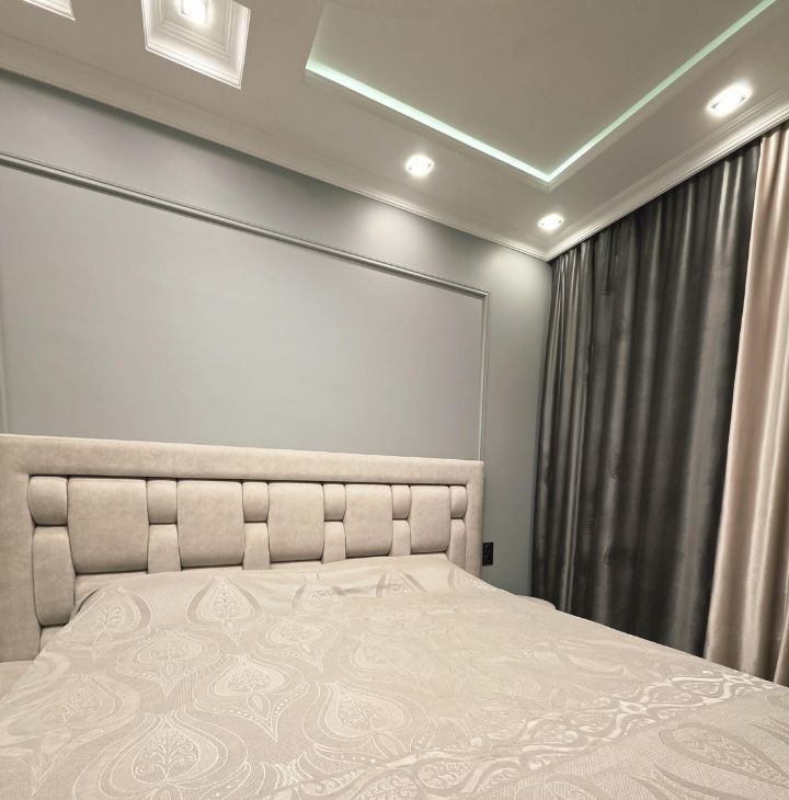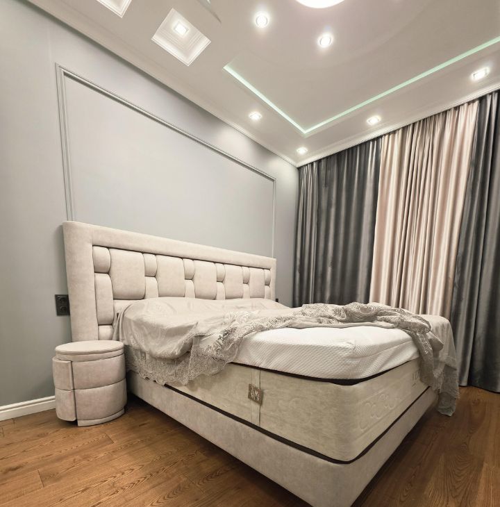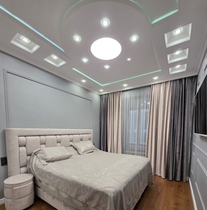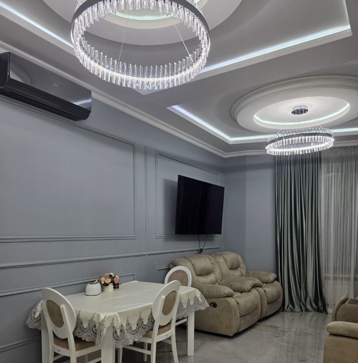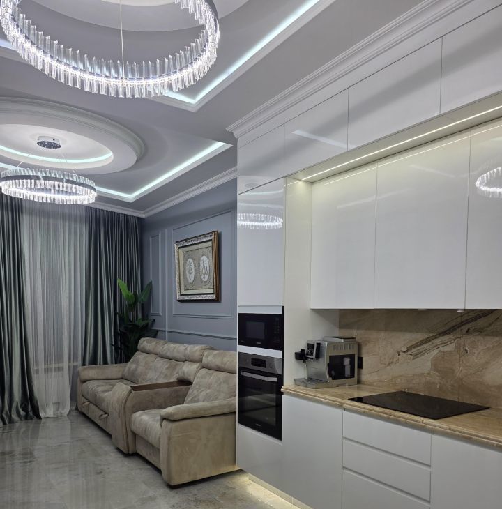В квартире сделан дизайнерский ремонт. Она полностью меблирована: в комнатах и на кухне есть вся необходимая мебель. Кухня оборудована современной техникой, включая холодильник и посудомоечную машину на 12 персон, фильтр для воды. Диваны и кресла с реклайнерами, телевизор нового поколения, не искажает изображение при просмотре с любого угла. Для вашего комфорта установлены кондиционер в гостиной и в спальне. Спальня оснащена встроенным сейфом, все шкафы с подсветкой во время открытия. В квартире два совмещенных санузла, один из которых оснащен ванной со стиральной машинкой с функцией сушки, а другой — душевой кабиной. Есть один балкон, где можно наслаждаться утренним кофе.