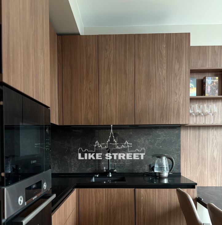 Просторная зона с современным кухонным гарнитуром, встроенной техникой и местом для обеденного стола. Отдельная зона отдыха с диваном и телевизора.
