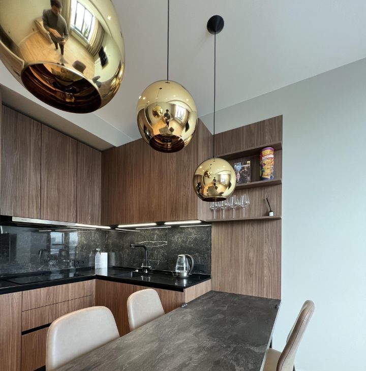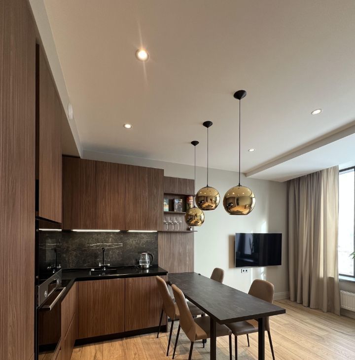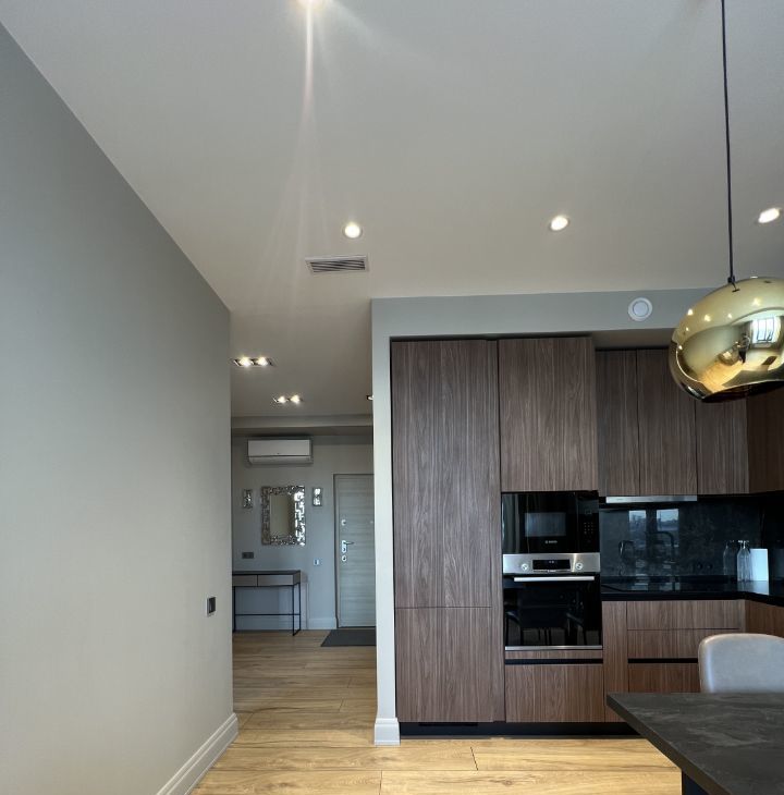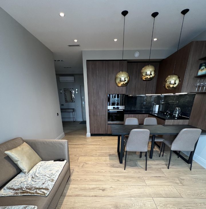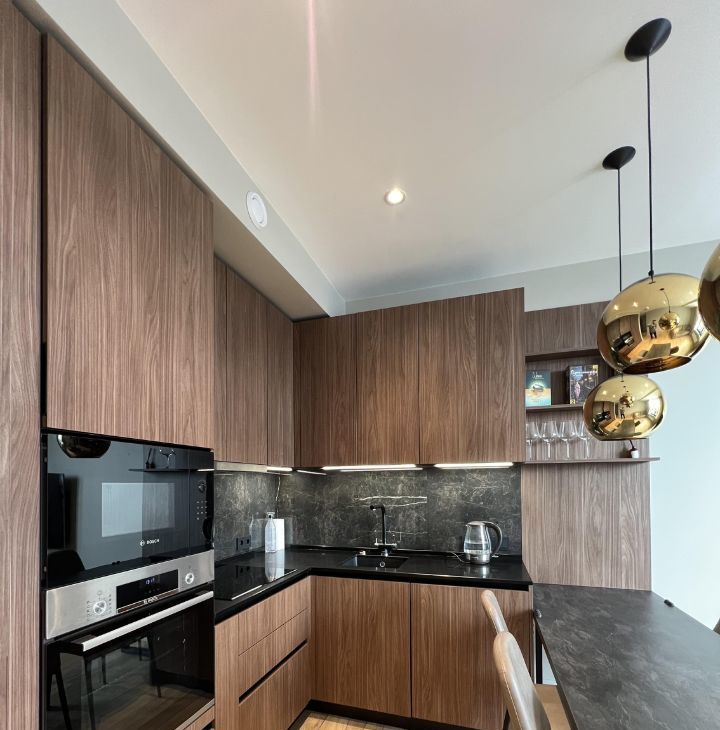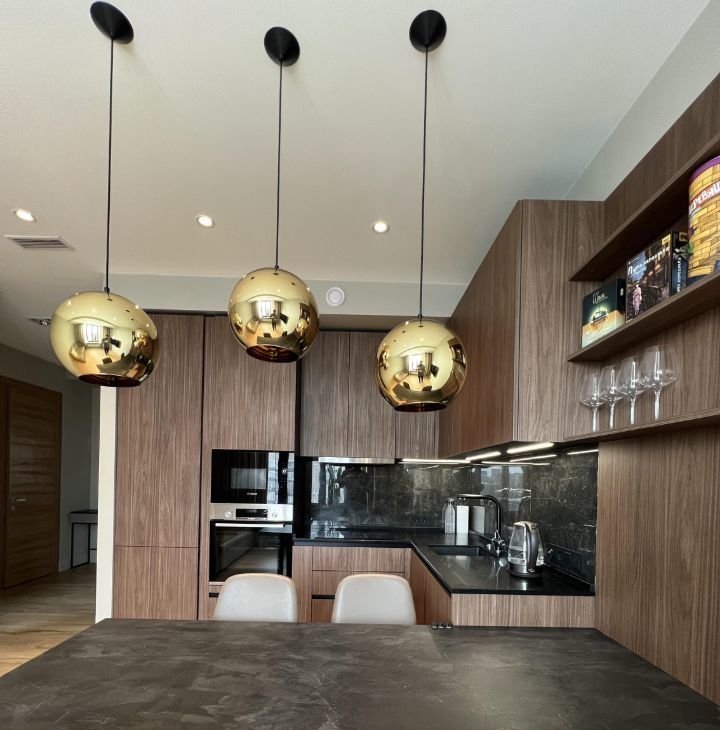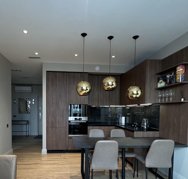 В квартире использованы только премиальные материалы: итальянская мебель, техника Neff и Bosch, столешница из натурального камня, встроенный фильтр для воды.