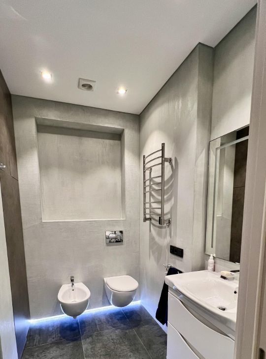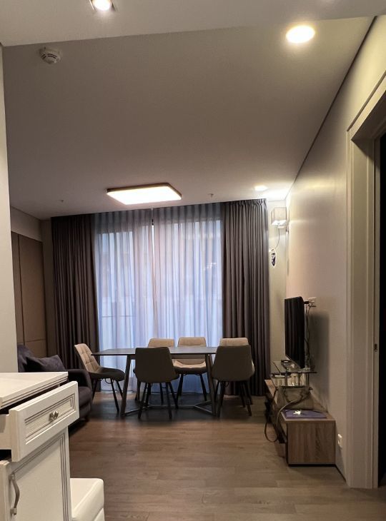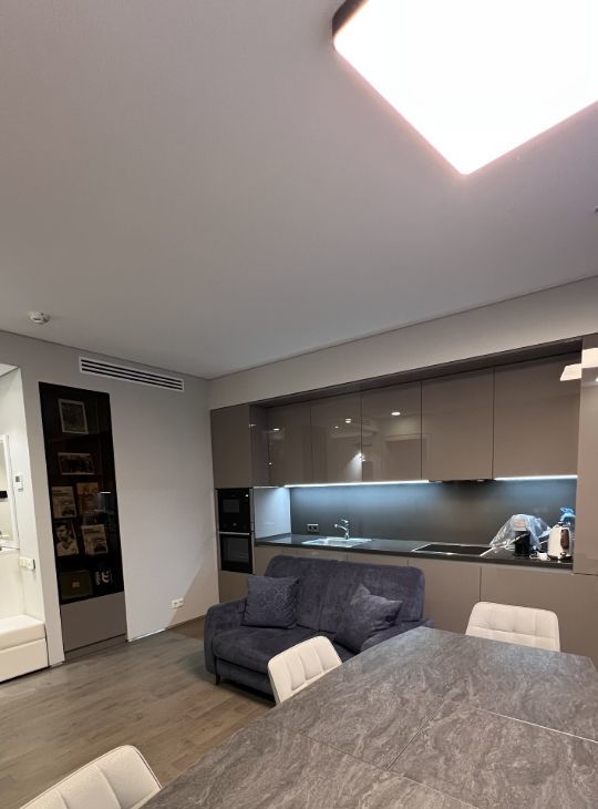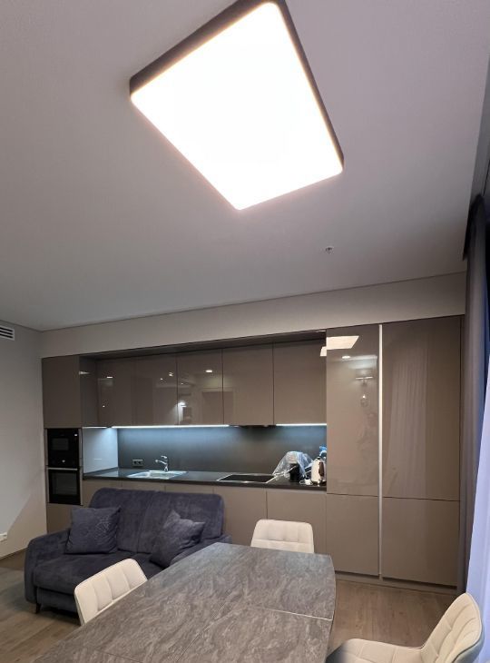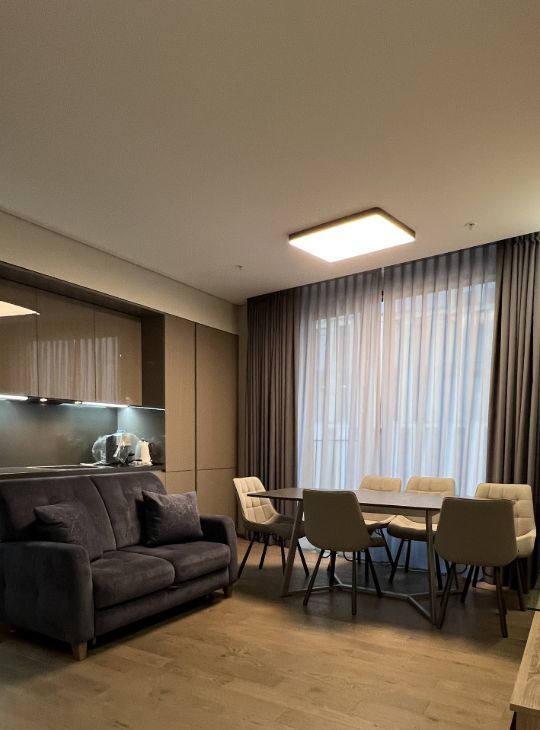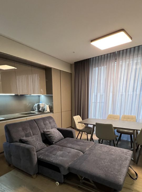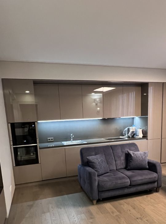 Планировка: просторная кухня-гостиная, светлая прихожая, спальня, совмещенный санузел с душем, гардеробная, постирочная с кладовой. Выполнен качественный дизайнерский ремонт с использованием премиальных материалов. Встроенная немецкая техника NEFF, мебель выполнена на заказ.