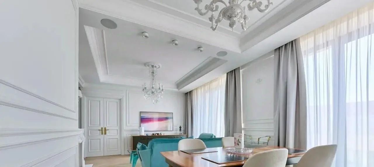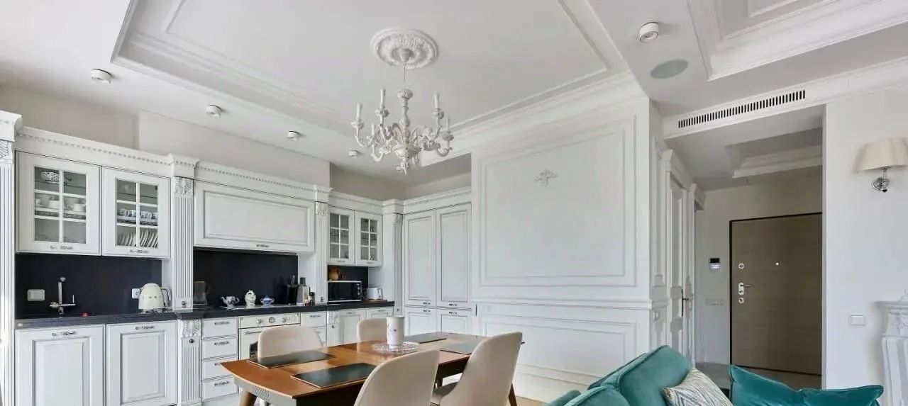 Просторная кухня-гостиная, мастер спальня с ванной и гардеробной, в прихожей вторая гардеробная и постирочная. Потолки в чистовом фомате 3 метра, что дополнительно создаёт ощущение простора.