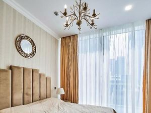 Внутреннее пространство квартиры включает в себя просторную гостиную, объединённую с кухней, уютную спальню, два санузла — один из которых с биде и ванной, а также две гардеробные, одна из которых имеет размеры 10 м². Апартаменты полностью укомплектованы современной мебелью и техникой, включая посудомоечную и стиральную машины, холодильник, микроволновую печь, кондиционеры в каждой комнате и даже кофемашину. Для вашего удобства предусмотрен подогрев полов на кухне и в санузлах, а также высокоскоростной интернет и кабельное телевидение.