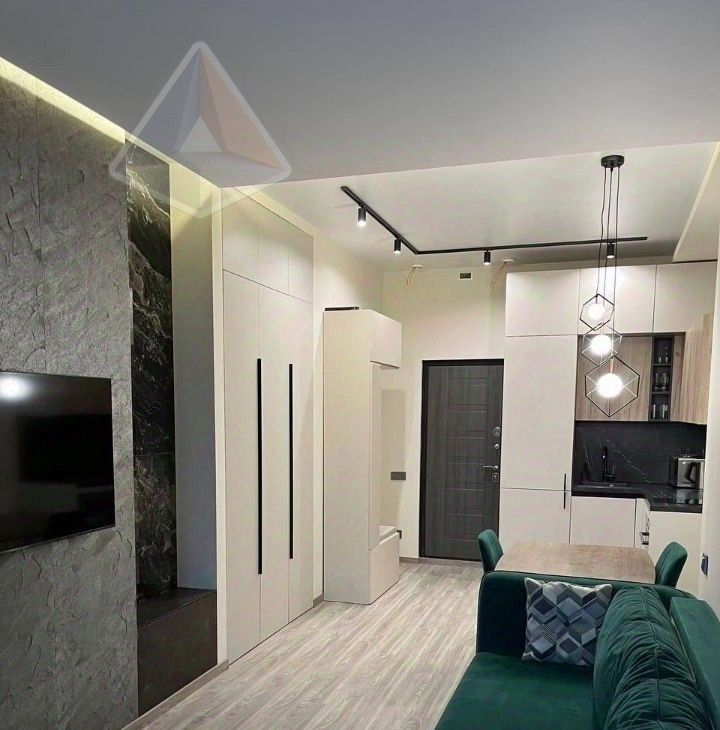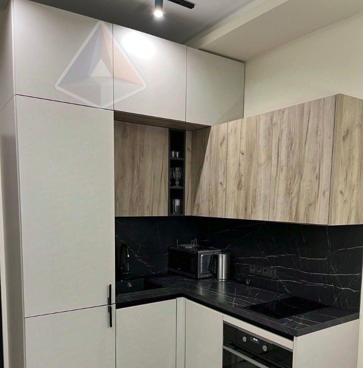 Просторные апартаменты 40 м² на 9 этаже (потолки 3,2 м): большая кухня 20 м², жилая комната 15 м², смежная планировка, совмещённый санузел с душевой кабиной, вид во двор. Дизайнерский стиль, современная мебель, полная техника: кондиционер, холодильник, посудомоечная и стиральная машины, телевизор, интернет — всё для комфортной жизни. Мусоропровод, подземный паркинг, двор без машин.