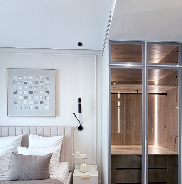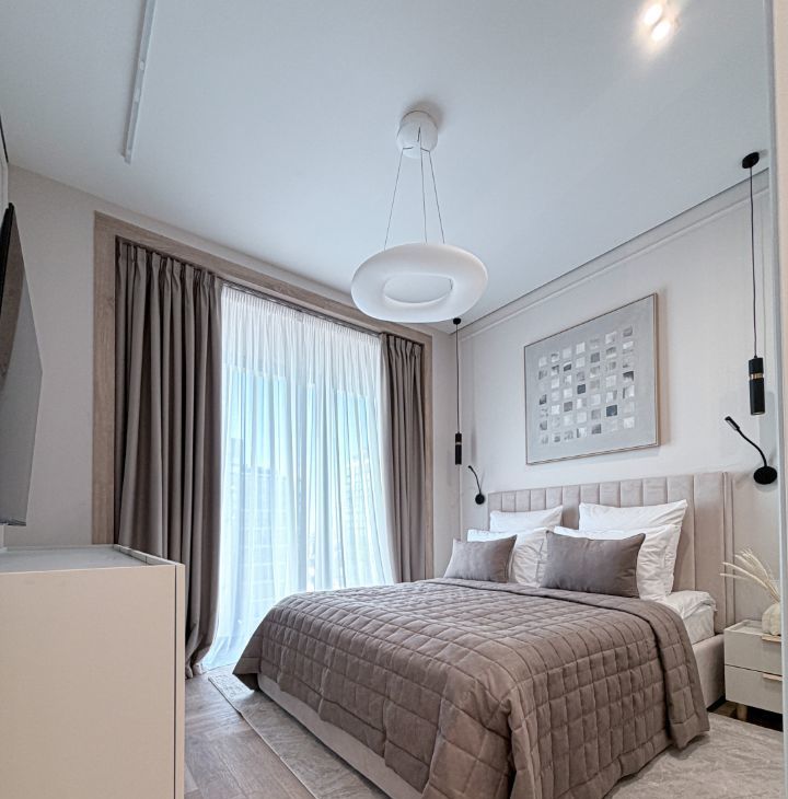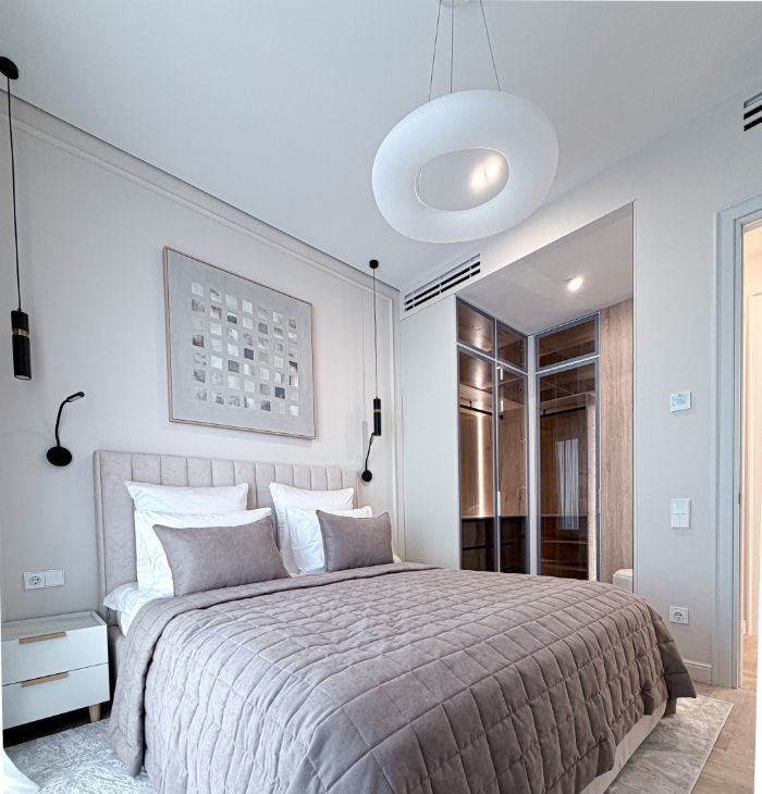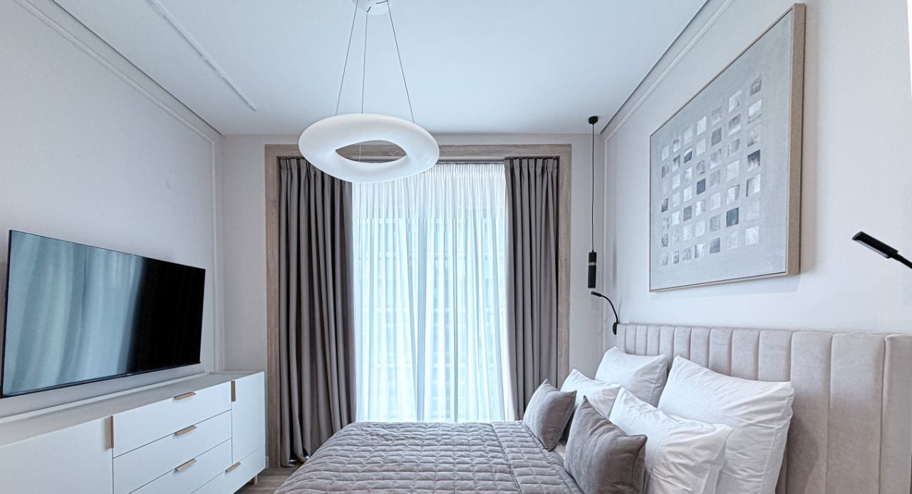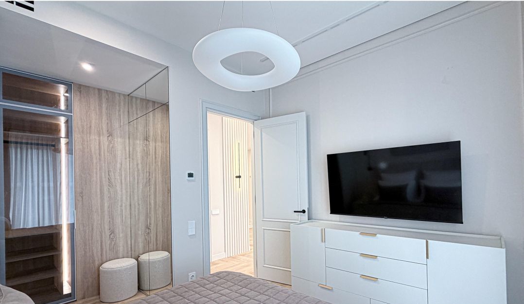 - Спальная комната оснащена кровать с подъемным механизмом 160/200, прикованными тумбой, телевизором и гардеробной.