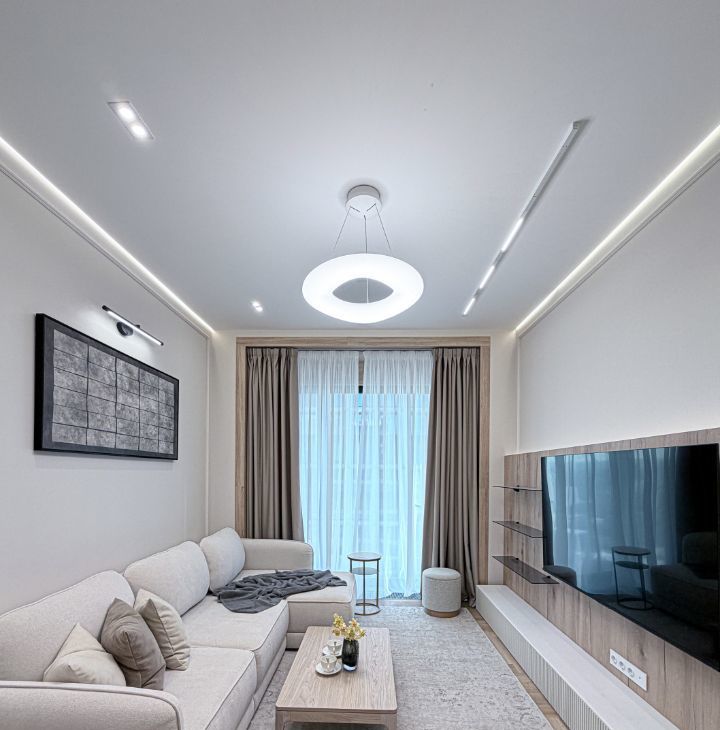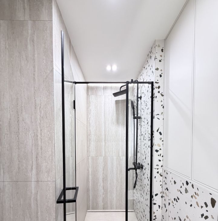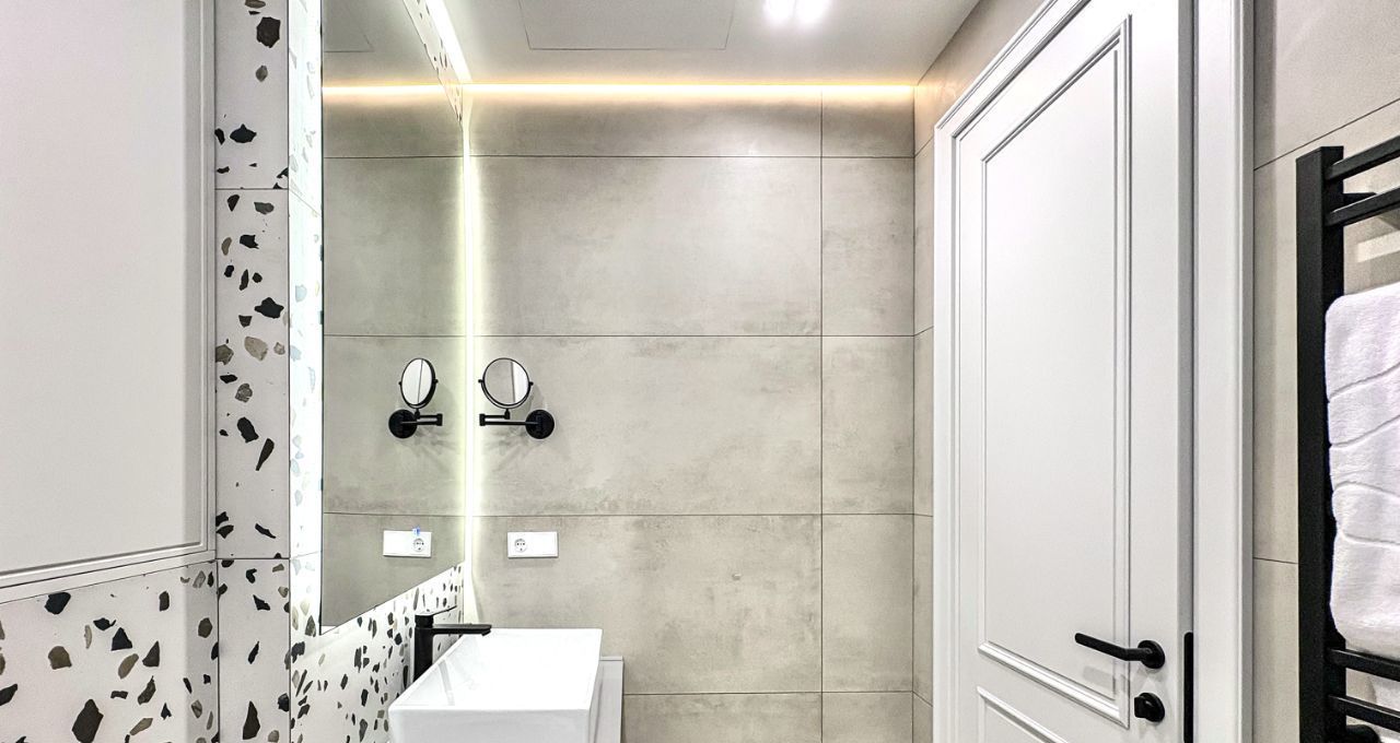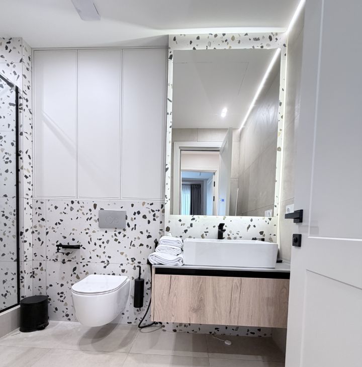 - Душевая кабина с подсветкой, санузел, стиральная машиной с функцией сушкой и большая зеркало с подсветкой;