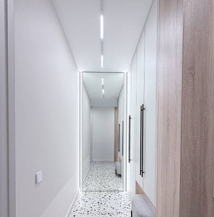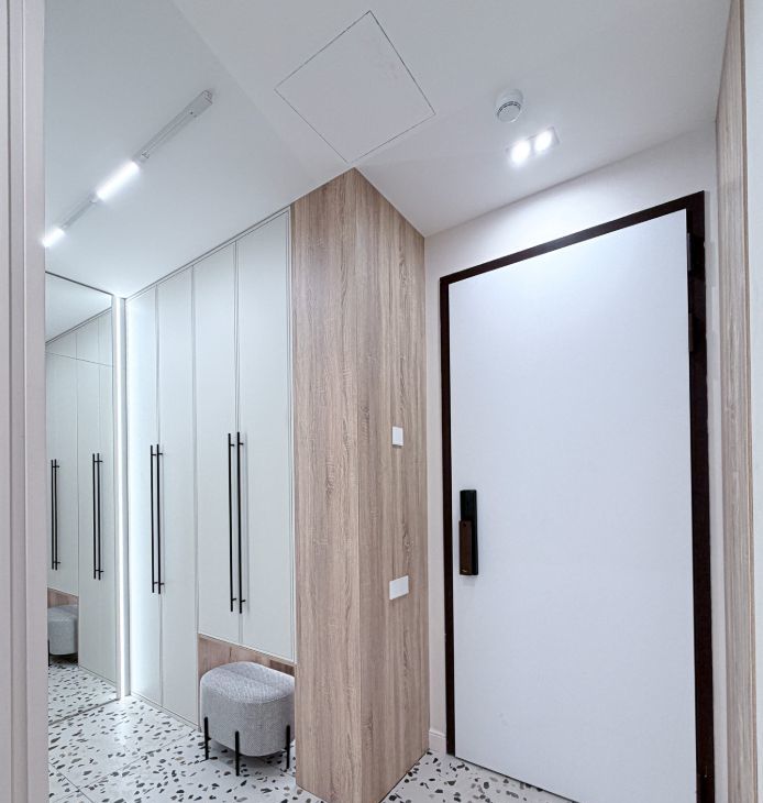 - прихожая с вместительными шкафами и пуфиком и зеркалом на полный рост;