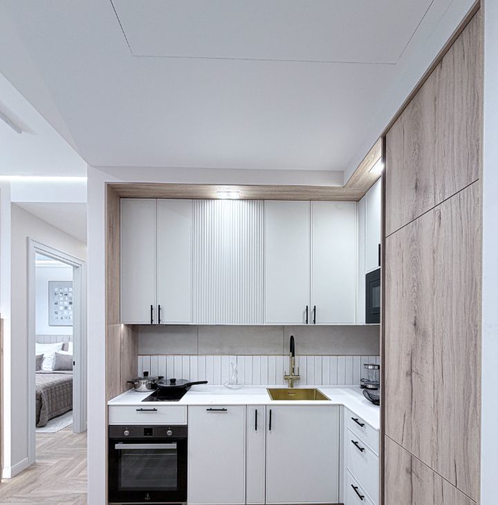 - кухонный гарнитур со всеми необходимыми бытовой техникой и стол с четырьмя стульями;