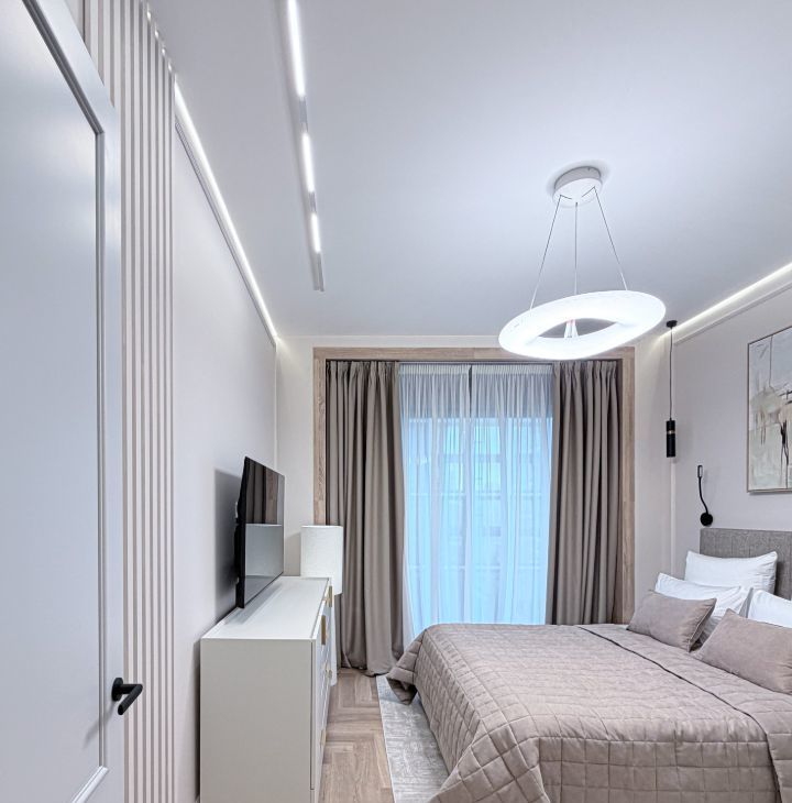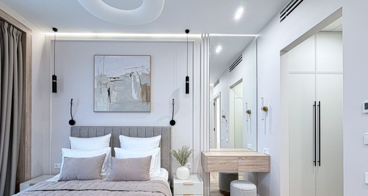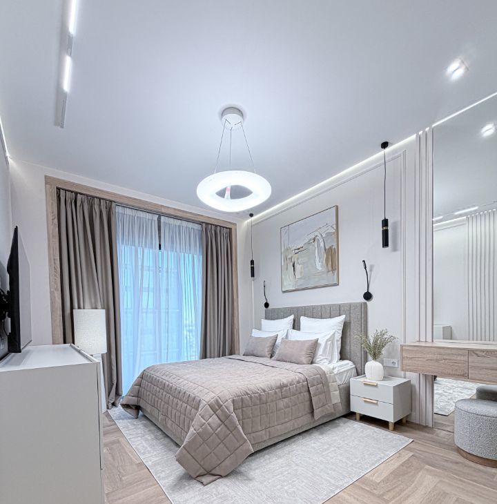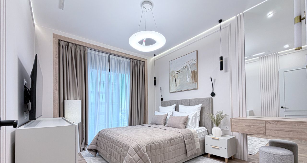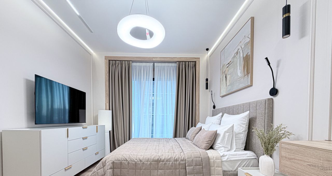 - мастер-спальная оснащена кровать с подъемным механизмом 160/200, прикованными тумбой, телевизором, комод по телевизором, зеркало, гардеробной с проходом в ванную комнату с санузлом, гигиенический душ, зеркало с подсветкой и умывальник.