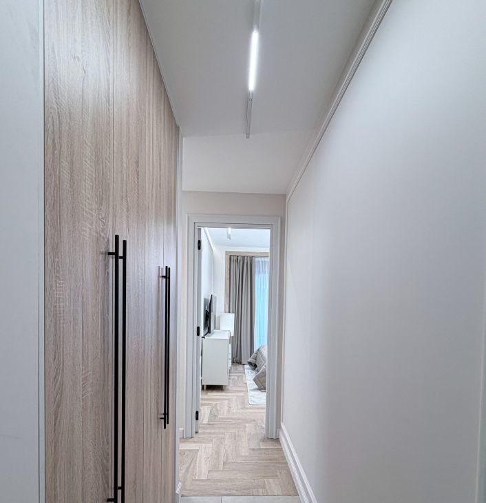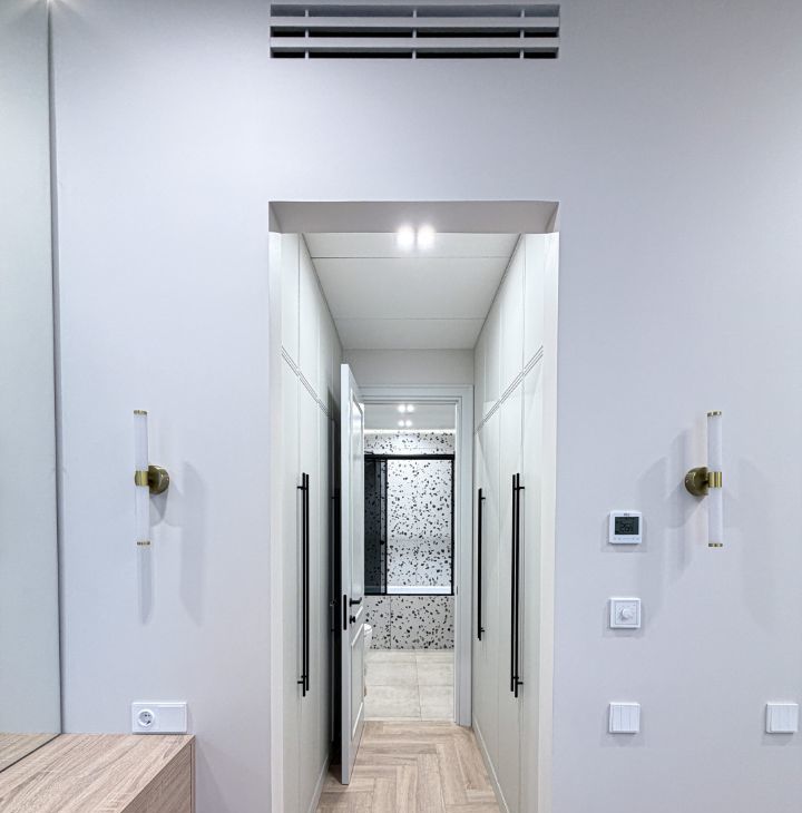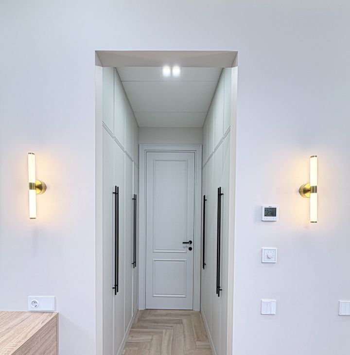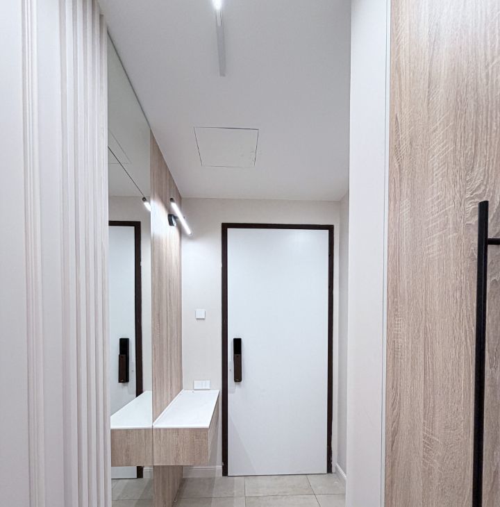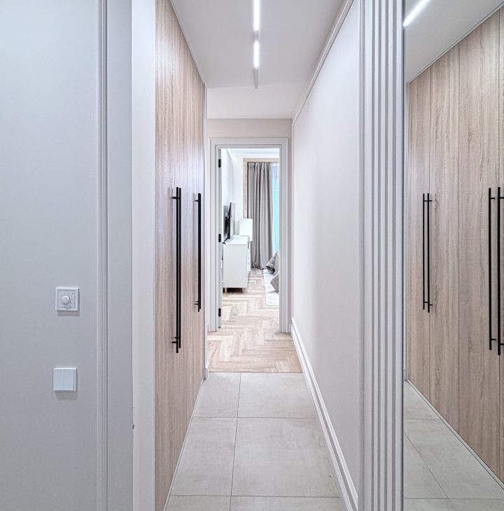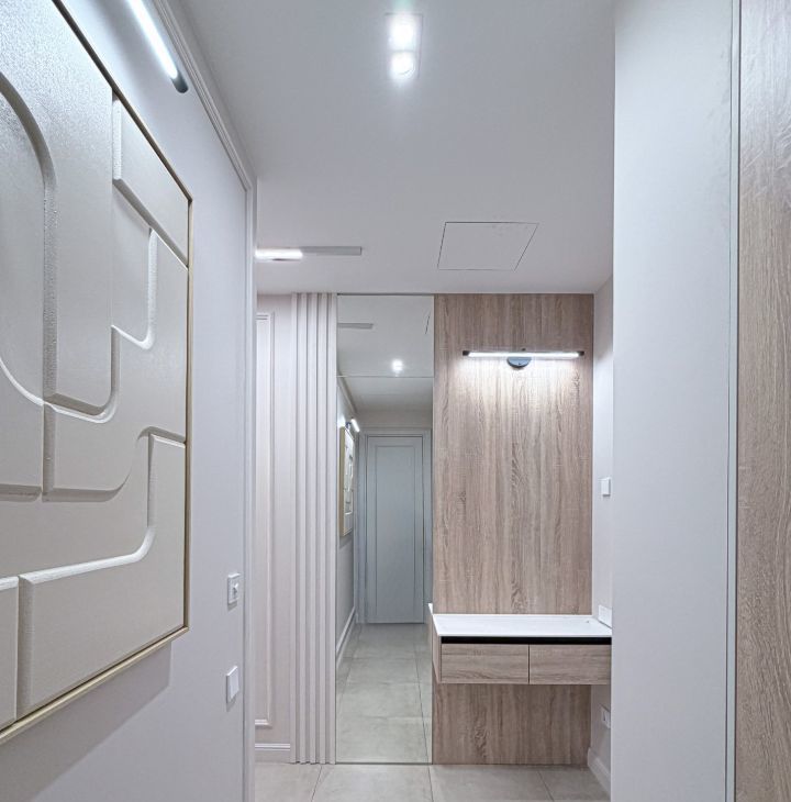 - прихожая с вместительными шкафами и пуфиком и зеркалом на полный рост;