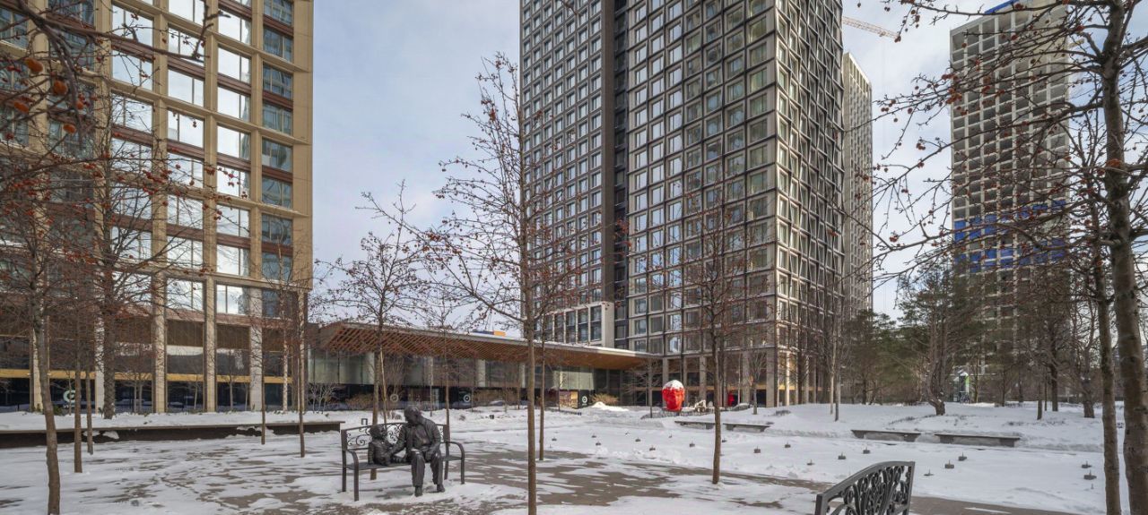 Закрытая территория с 6-гектарным парком внутри квартала. Фонтаны, арт-объекты, детские площадки и воркаут. На первых этажах — фитнес, салоны и рестораны. Ленинградский проспект, 37: близко к центру, но с пригородным комфортом.