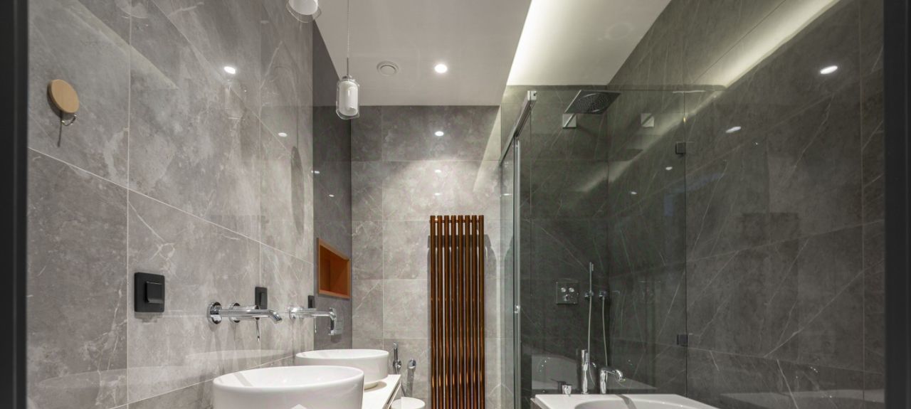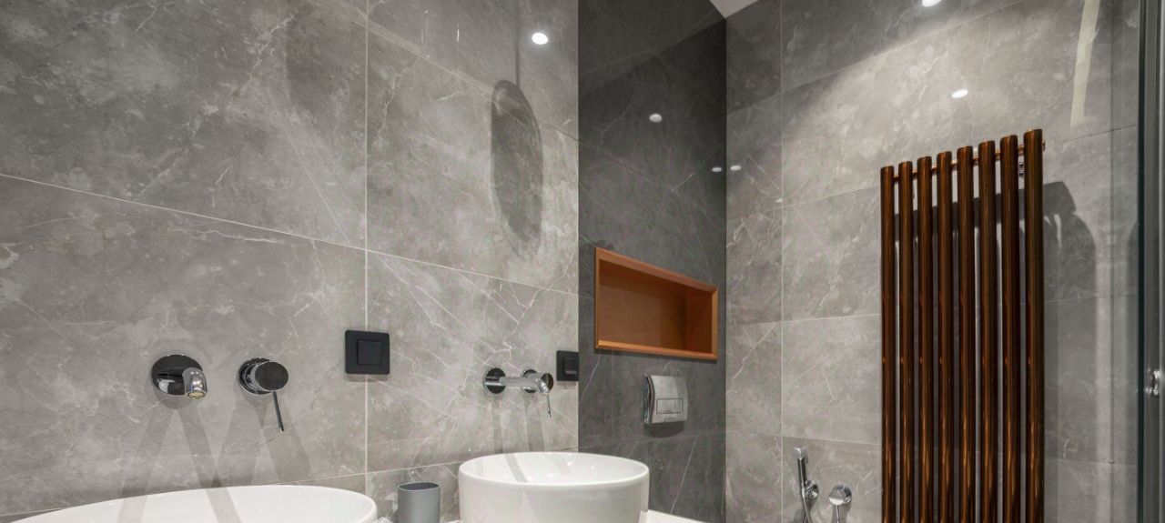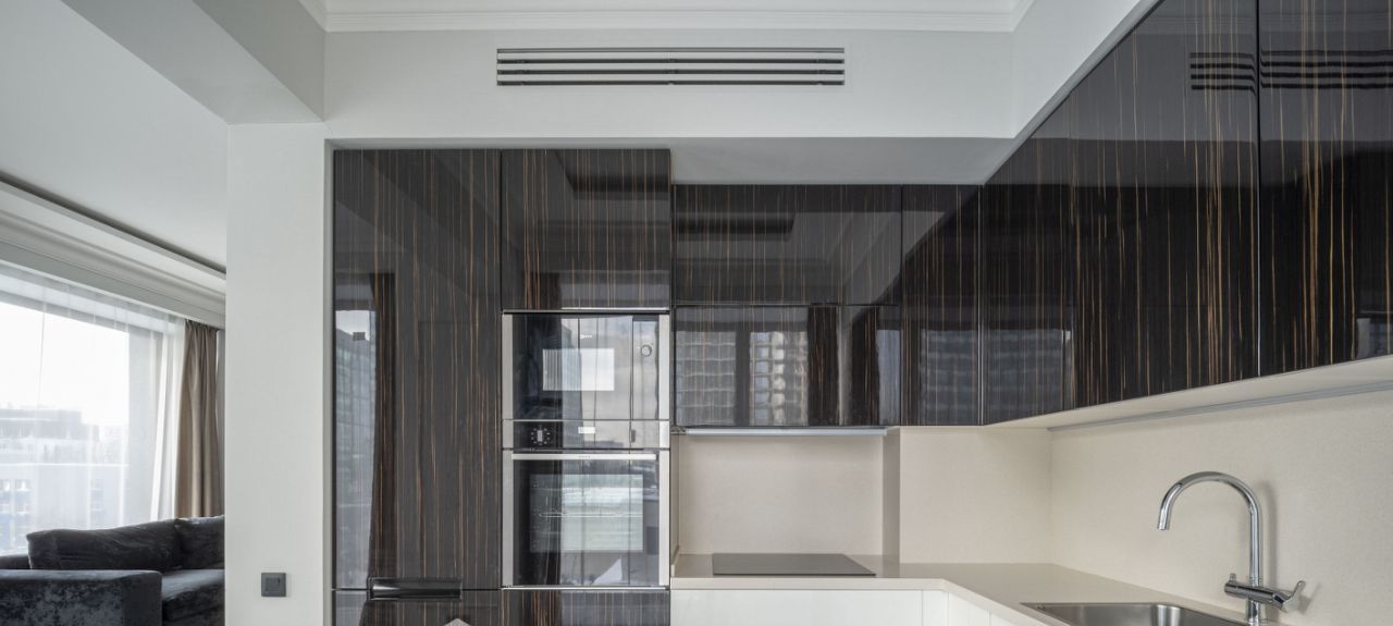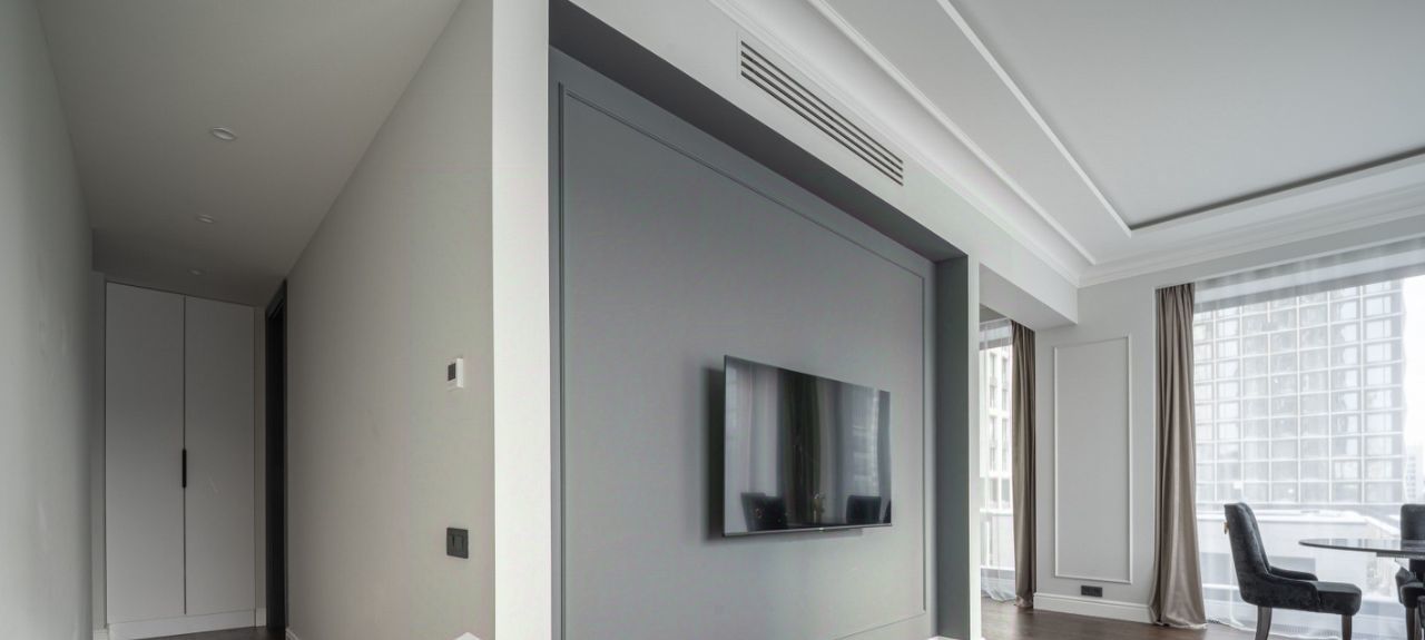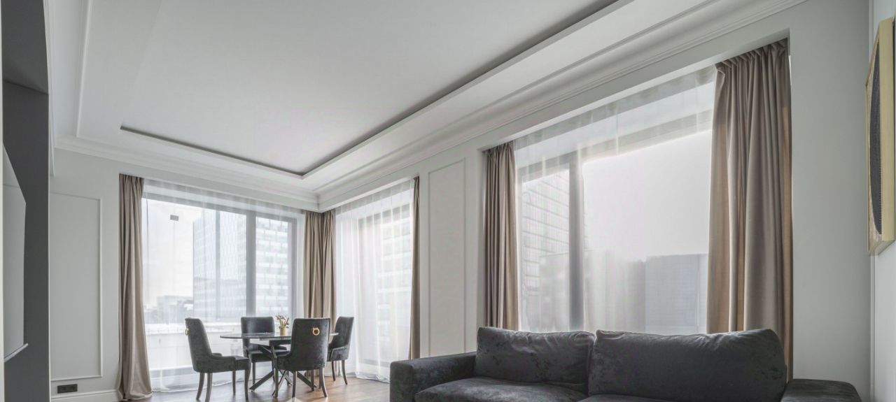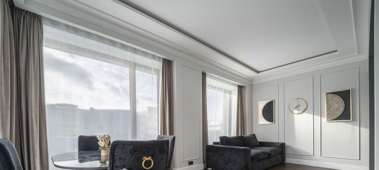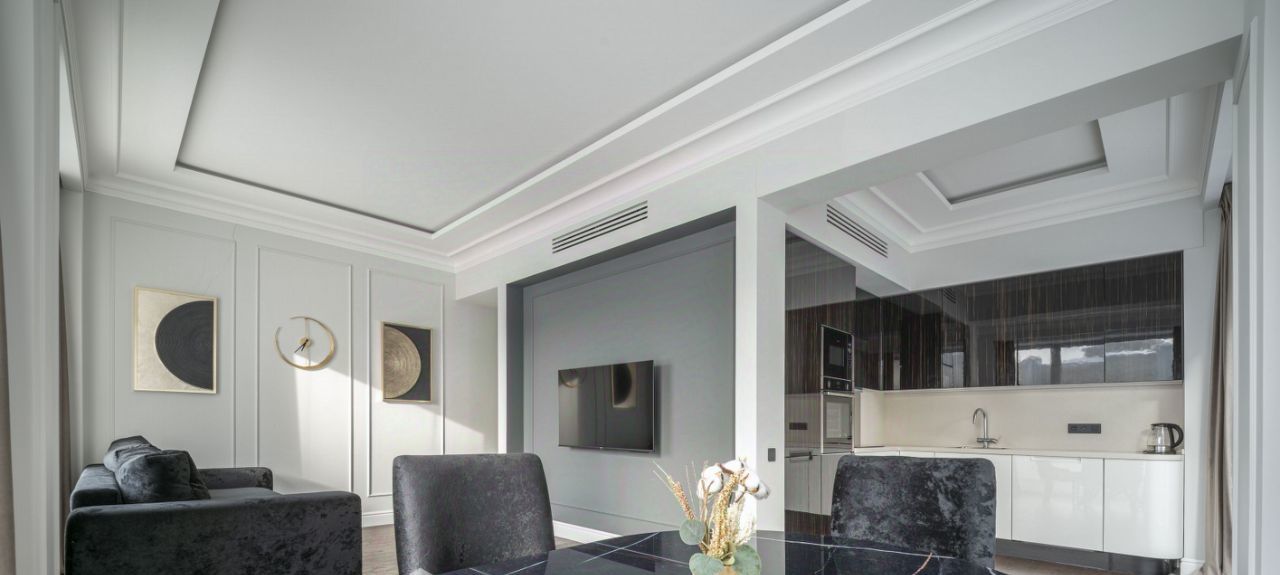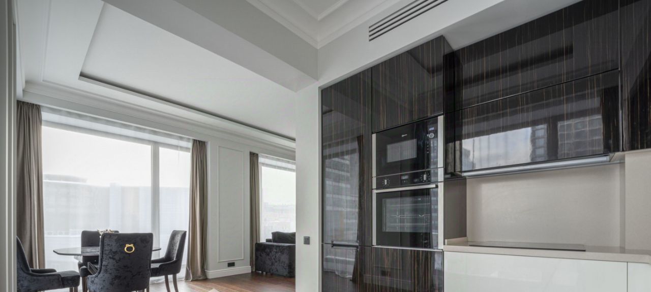 Глянцевая кухня деликатно спрятана в глубине гостиной, чтобы утренний завтрак оставался только вашей историей. Мягкий серый диван, круглый стол и кремовые кресла ждут ваших вечеров. Воздух здесь пахнет новизной — в этой квартире ещё никто не жил.