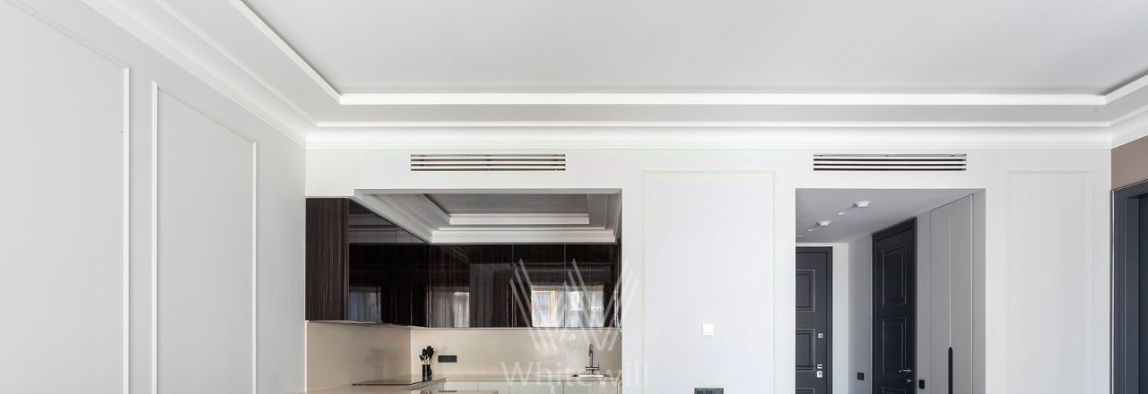 Спланирована просторная кухня-гостиная с обеденной зоной, мастер-спальня с собственной ванной комнатой и гардеробной, гостевой санузел, прихожая с встроенными шкафами. Апартаменты полностью меблированы и оборудованы бытовой техникой Neff. Из окон открывается вид в благоустроенный двор-парк с фонтанами.